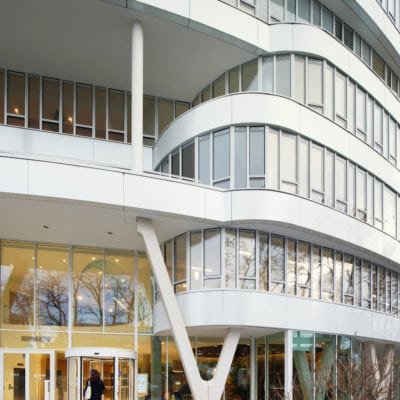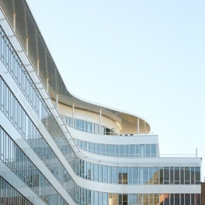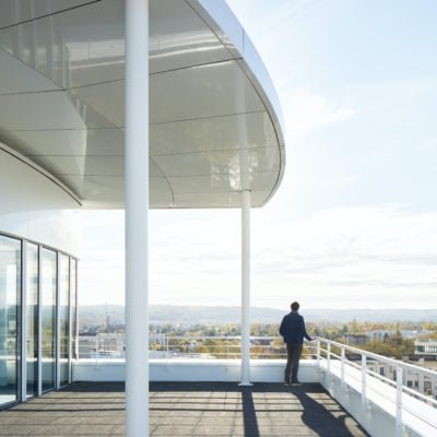 Es ist interessant, die Angemessenheit des Ory Architecture-Projekts mit der Marke seines Kunden festzustellen. Die Mission von Danone ist es, so vielen Menschen wie möglich Gesundheit durch Lebensmittel zu bringen. Kein Wunder also, dass die Zentrale des Konzerns die Farbe Weiß annimmt. Es erinnert an die Reinheit und damit an die Nährwertqualität der Produkte der Marke. Darüber hinaus bedeutet die Durchgängigkeit der Fenster, dass es nichts zu verbergen gibt, keine Schattenzone. Schließlich spiegelt der Glanz der perlmuttfarbenen Aluminiumfronten das Bild von Forschung und Entwicklung wieder.