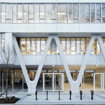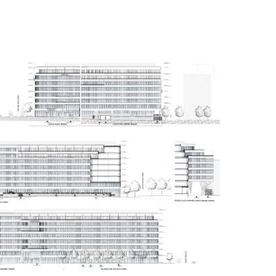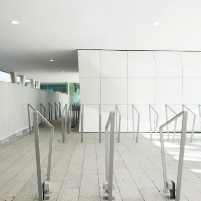 Die Fassade verbirgt die Träger auf den Etagen, um nur die Glasstreifen zu zeigen, die durch die Sockel geschichtet sind. Die ersten beiden Ebenen hingegen ziehen die Aufmerksamkeit der Passanten durch die V-förmigen Pfosten auf sich, die auf zwei Ebenen eine Wellenbewegung erzeugen. Diese Säulen sind wie die Fassade mit weißen Metallelementen verkleidet. Wir werden auch eine relativ dezente Beschilderung des Ortes bemerken, die zu seiner städtebaulichen Integration beiträgt.