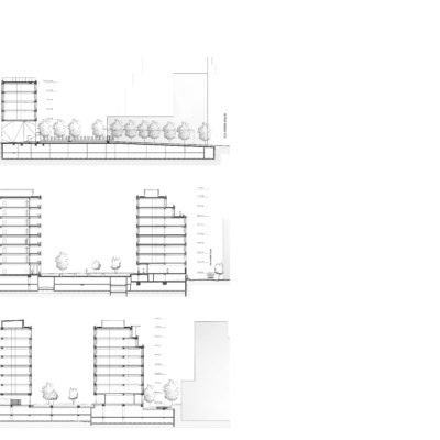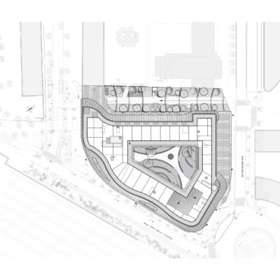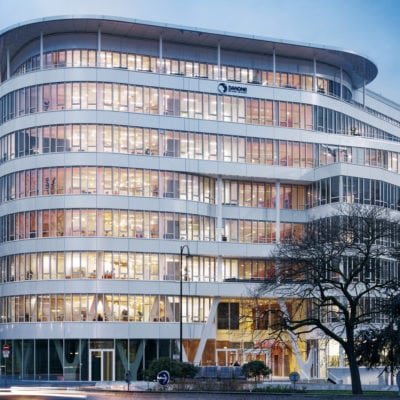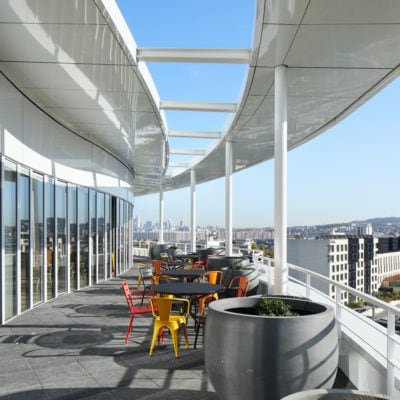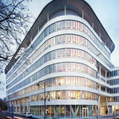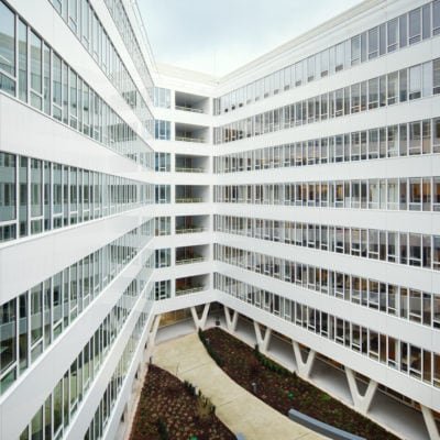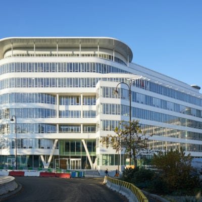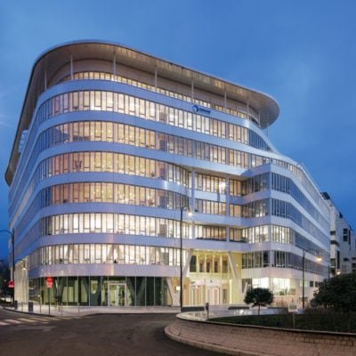 Lokalisiert in Rue des Deux Gares, der Große Firmensitz Danone nimmt gekrümmte Formen an, rund um den von A&J entworfenen zentralen Garten. Das 7 Etagen Gebäude stutzet auf das Erdgeschoss, welches einen Fahrradraum, ein Café und eine Betriebskantine beinhaltet. Die in Holz verkleidete Rezeption versucht, das Image von Büros loszuwerden, indem sie sich vom Vokabular der Hotellerie inspirieren lässt.