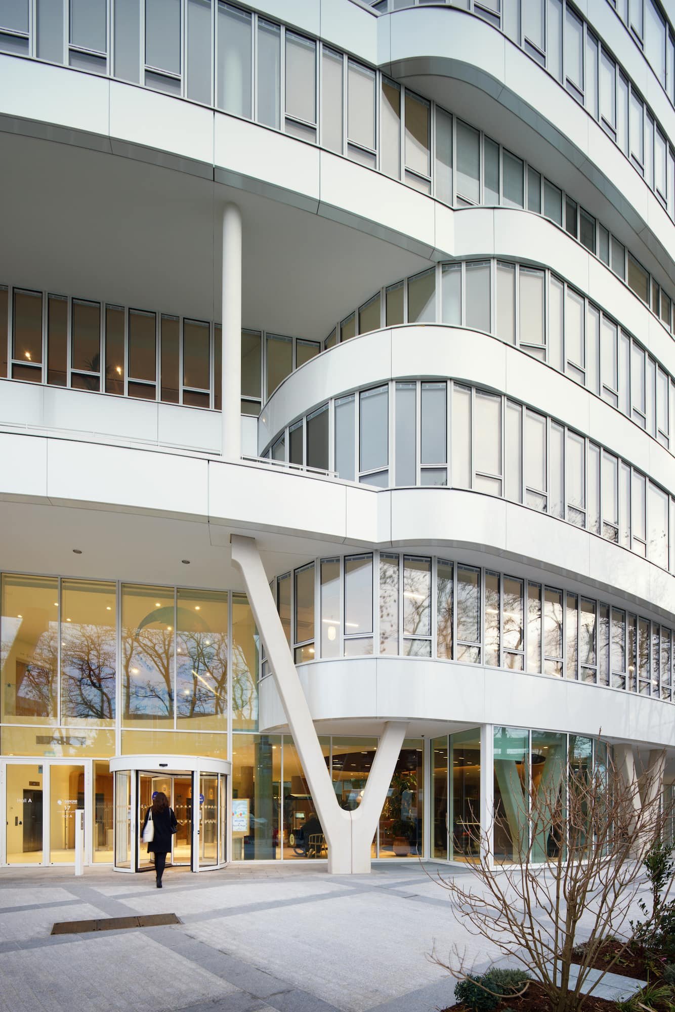 Es ist interessant, die Angemessenheit des Ory Architecture-Projekts mit der Marke seines Kunden festzustellen. Die Mission von Danone ist es, so vielen Menschen wie möglich Gesundheit durch Lebensmittel zu bringen. Kein Wunder also, dass die Zentrale des Konzerns die Farbe Weiß annimmt. Es erinnert an die Reinheit und damit an die Nährwertqualität der Produkte der Marke. Darüber hinaus bedeutet die Durchgängigkeit der Fenster, dass es nichts zu verbergen gibt, keine Schattenzone. Schließlich spiegelt der Glanz der perlmuttfarbenen Aluminiumfronten das Bild von Forschung und Entwicklung wieder.