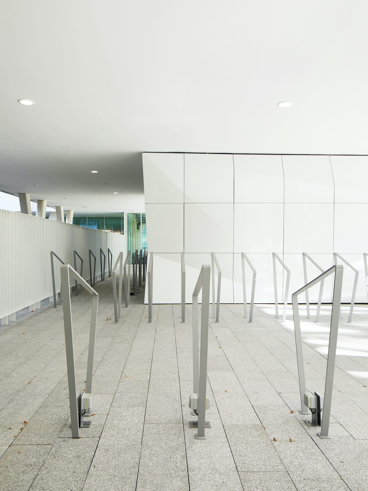Die Fassade verbirgt die Träger auf den Etagen, um nur die Glasstreifen zu zeigen, die durch die Sockel geschichtet sind. Die ersten beiden Ebenen hingegen ziehen die Aufmerksamkeit der Passanten durch die V-förmigen Pfosten auf sich, die auf zwei Ebenen eine Wellenbewegung erzeugen. Diese Säulen sind wie die Fassade mit weißen Metallelementen verkleidet. Wir werden auch eine relativ dezente Beschilderung des Ortes bemerken, die zu seiner städtebaulichen Integration beiträgt.