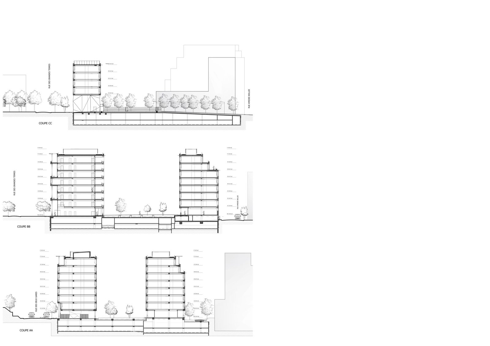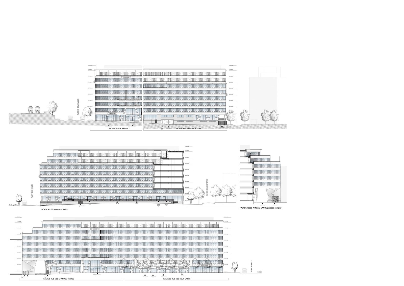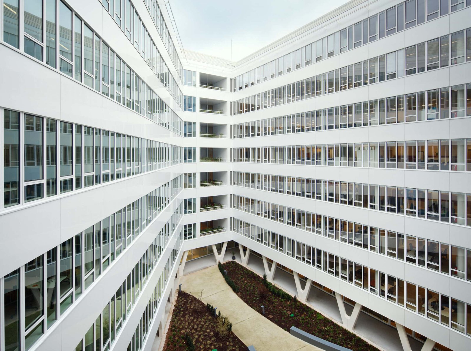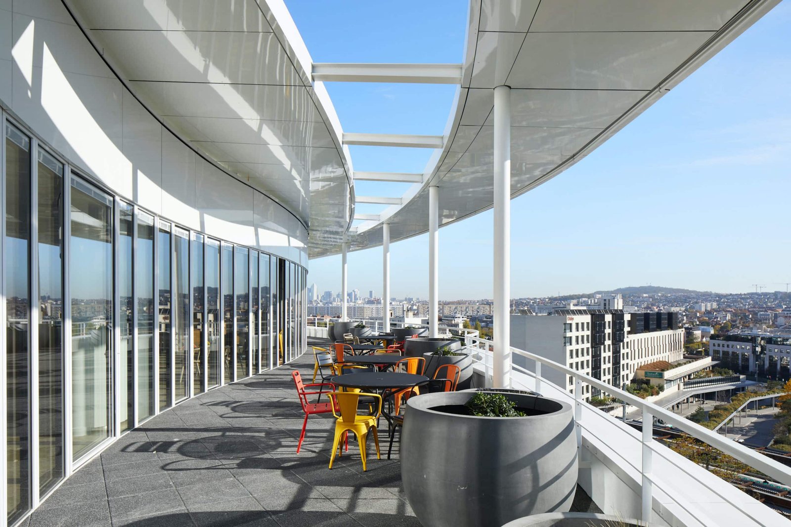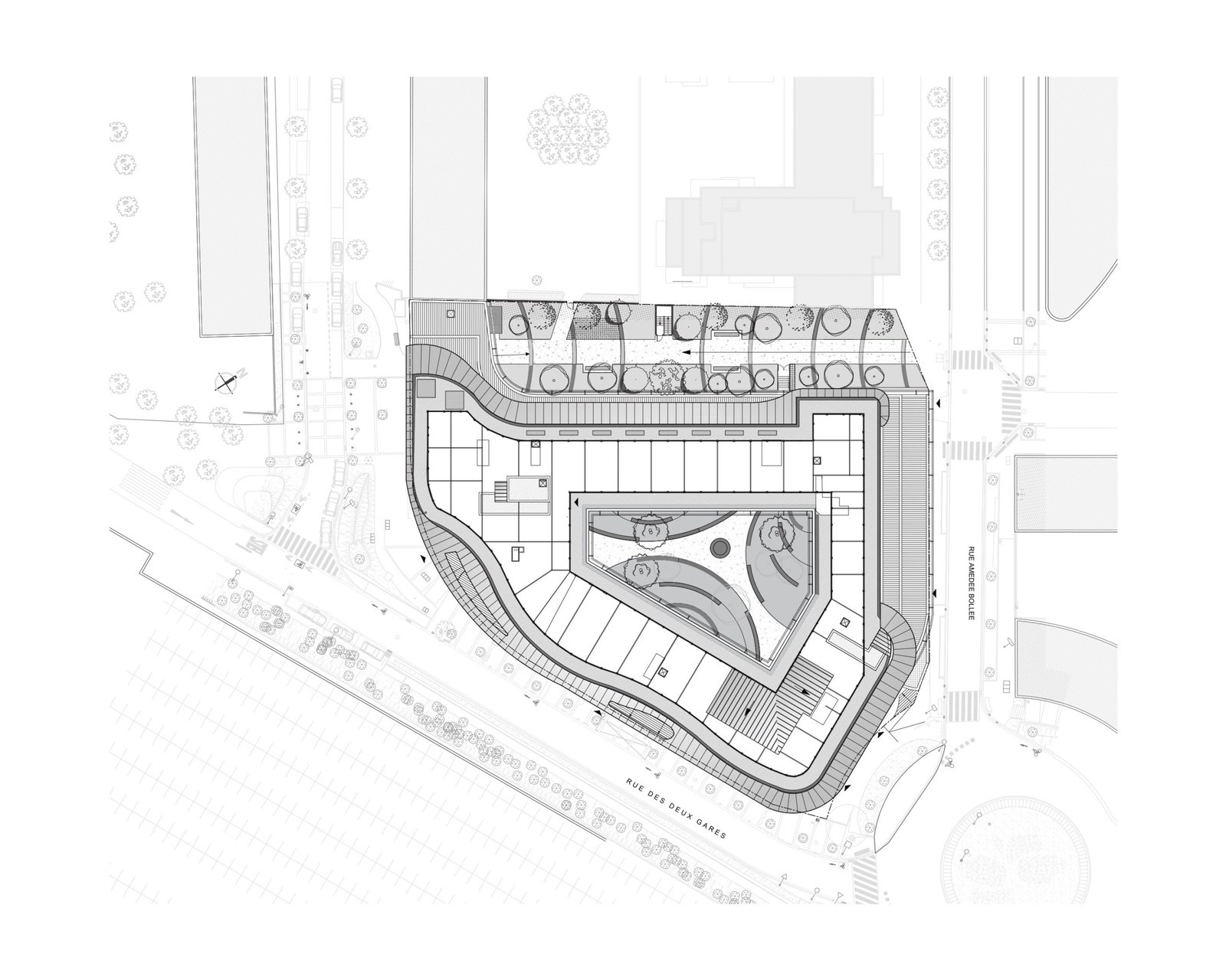Lokalisiert in Rue des Deux Gares, der Große Firmensitz Danone nimmt gekrümmte Formen an, rund um den von A&J entworfenen zentralen Garten. Das 7 Etagen Gebäude stutzet auf das Erdgeschoss, welches einen Fahrradraum, ein Café und eine Betriebskantine beinhaltet. Die in Holz verkleidete Rezeption versucht, das Image von Büros loszuwerden, indem sie sich vom Vokabular der Hotellerie inspirieren lässt.