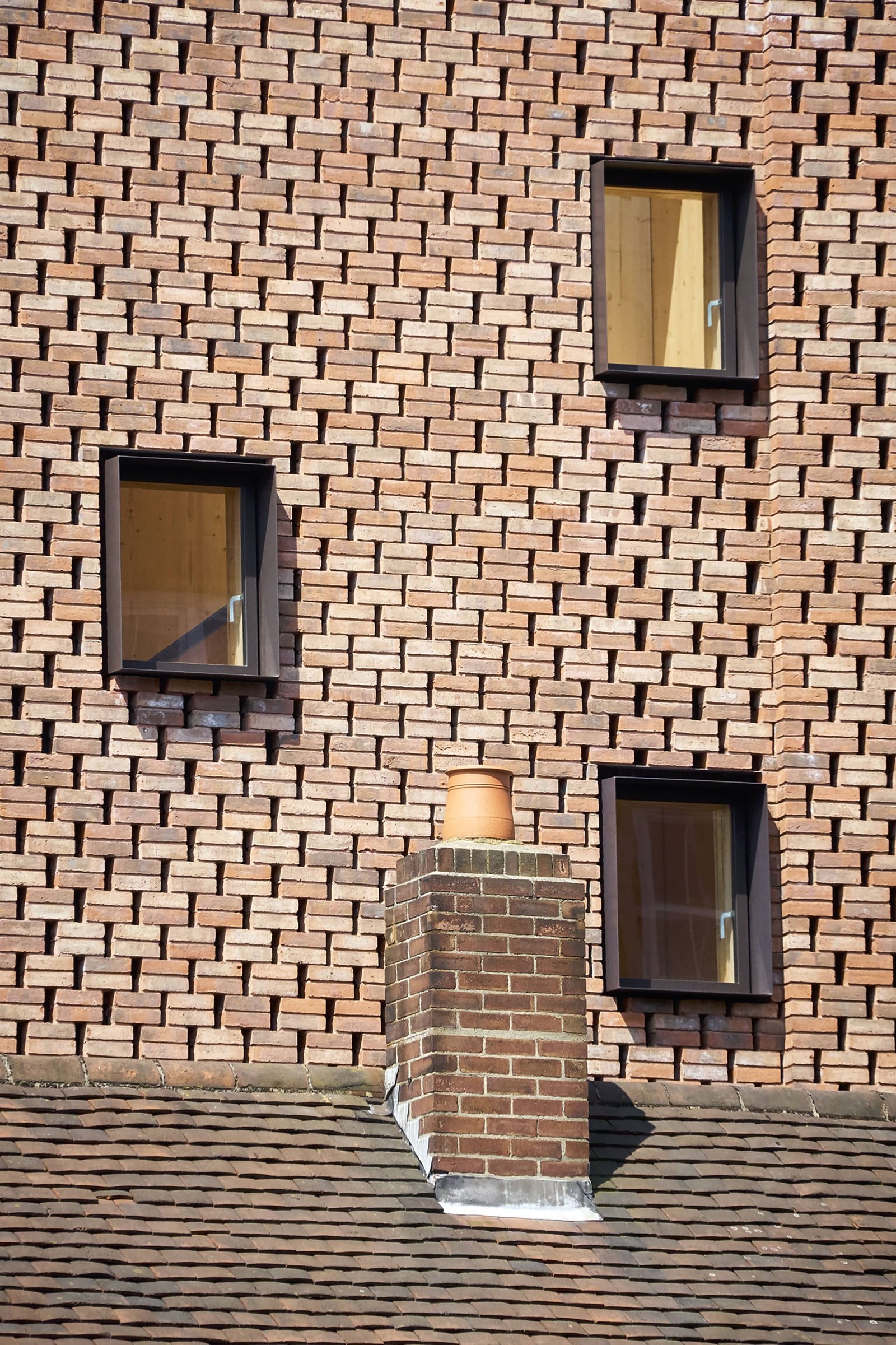 La brique vient masquer l’isolation thermique par l’extérieur dissimulée derrière un pare-vapeur. Les architectes ont eu l’audace de prolonger leur parement jusqu’à la toiture afin d’uniformiser l’enveloppe de l’immeuble. L’espacement entre les briques s’explique pour plusieurs raisons. Tout d’abord, les architectes souhaitent rendre lisible le caractère non porteur de la brique. Ensuite, la brique est un matériau qui travaille différemment que le bois, elle est donc sollicitée de manière différence. La porosité du parement permet ainsi à l’enveloppe de se dilater et de se contracter sans affecter la structure en bois lamellé-croisé.