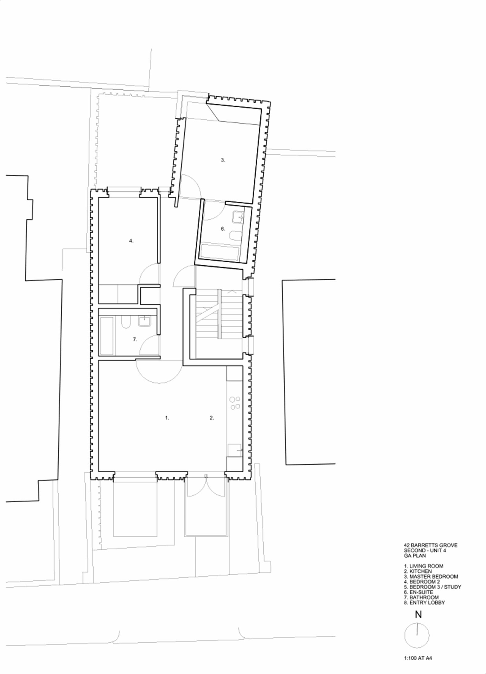 La rue Barrets Grove est principalement constituée de maisons mitoyennes à deux étages. Cette linéarité est ensuite interrompue par de récents petits immeubles et la présence de l’école primaire Princess May qui marque l’arrivée de la Stoke Newington Road. C’est cette dernière qui a impulsé l’idée de travailler les pignons du projet.