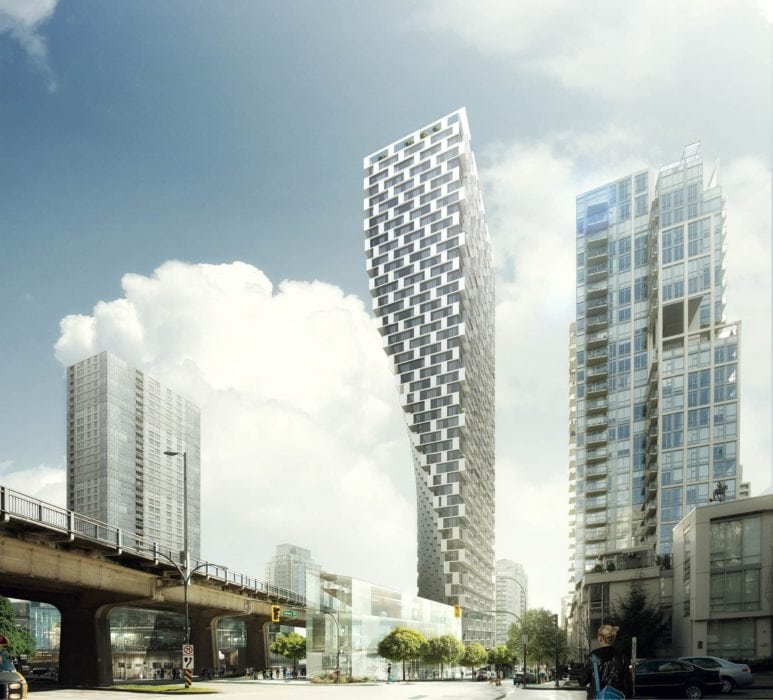 La façade décollée du sol alterne entre baies et revêtement isolant. Les façades sont sombres avec quelques touches de rouge, malgré ses 9 étages, le projet garde une impression horizontale grâce à son principe de strate renforcé par un revêtement en lamelle. L’attique du bâtiment renferme quelques plantations sur les balcons. La tour s’organise avec 2 T2, 2 T3 et un T4 par niveau courant et un T2, un T3 et un T5 tous dotés de terrasses au R+9.