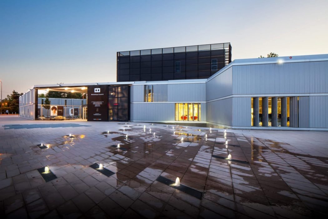 Des saules et des noues de rétention viennent tramer le parking. Les stationnements sont végétalisés pour répondre à la demande de la maîtrise d’ouvrage. À l’origine, un théâtre paysager devait s’installer en continuité du porte-à-faux. Finalement, c’est une pelouse en palier qui le remplace.