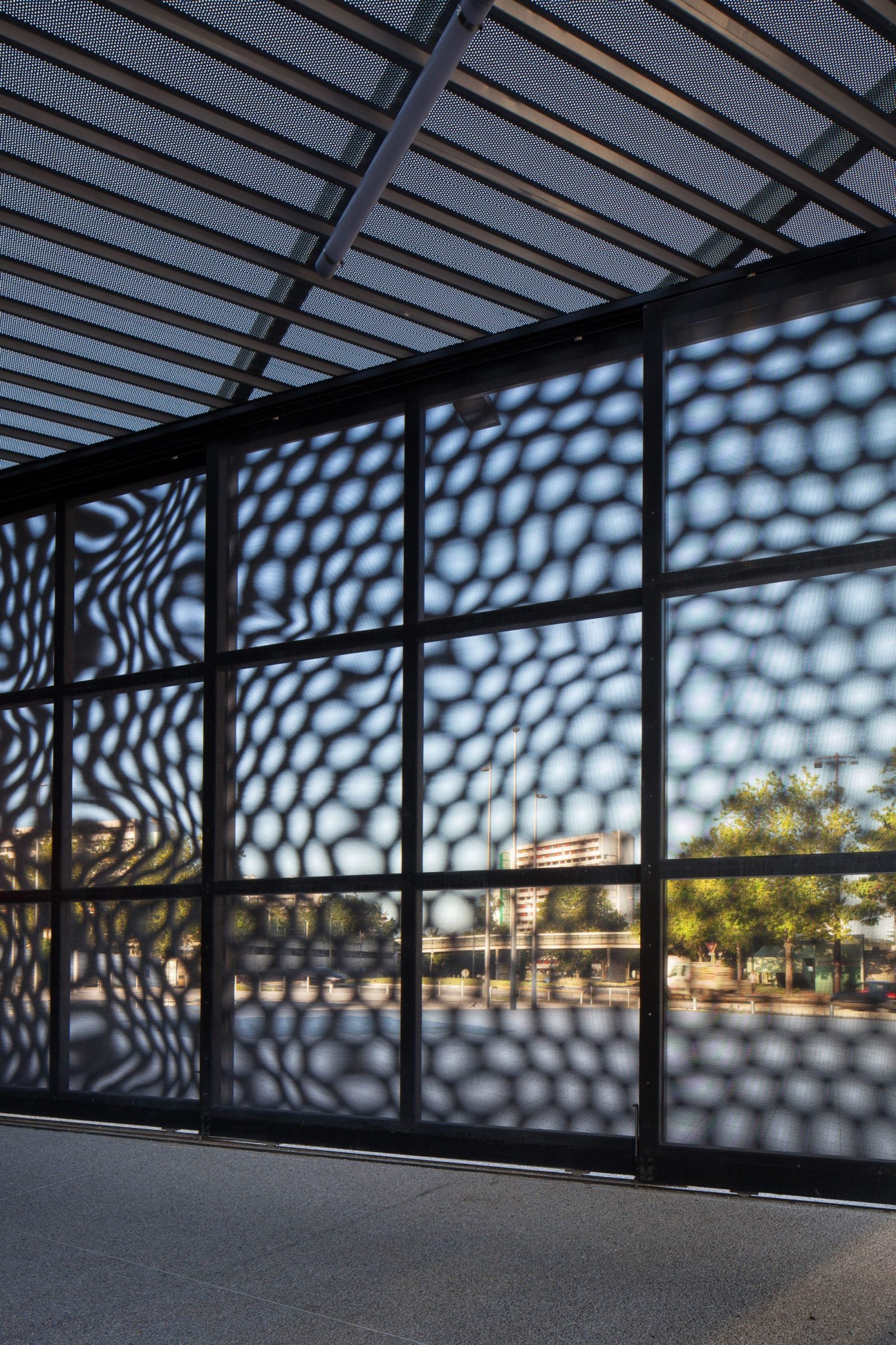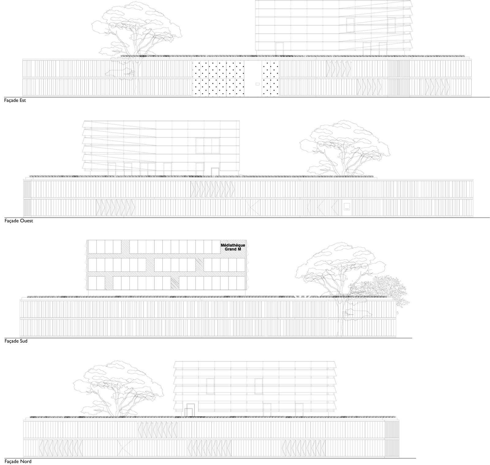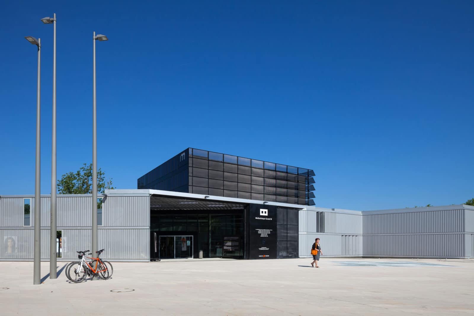 L’entrée de la médiathèque est dégagée afin de respecter les contraintes urbaines et également du au passage du métro en sous-sol. Ces deux éléments expliquent la forme non-conventionnelle de l’édifice. L’enceinte créée épouse ses limites, elle est matérialisée par un bandeau double hauteur de bardage métallique. C’est donc à l’intérieur de celle-ci que s’implante le bâtiment et où s’additionne une cours extérieure semi-couverte pour l’accueil des visiteurs. La façade quant à elle vient se plier pour s’ouvrir sur le rond-point.