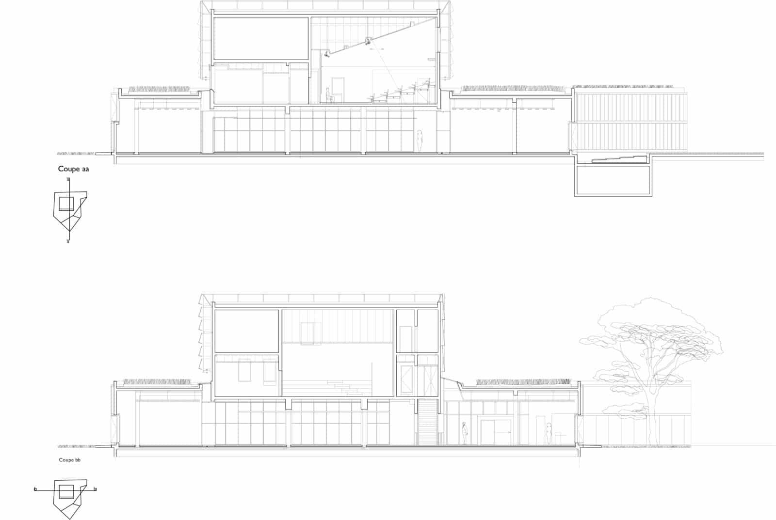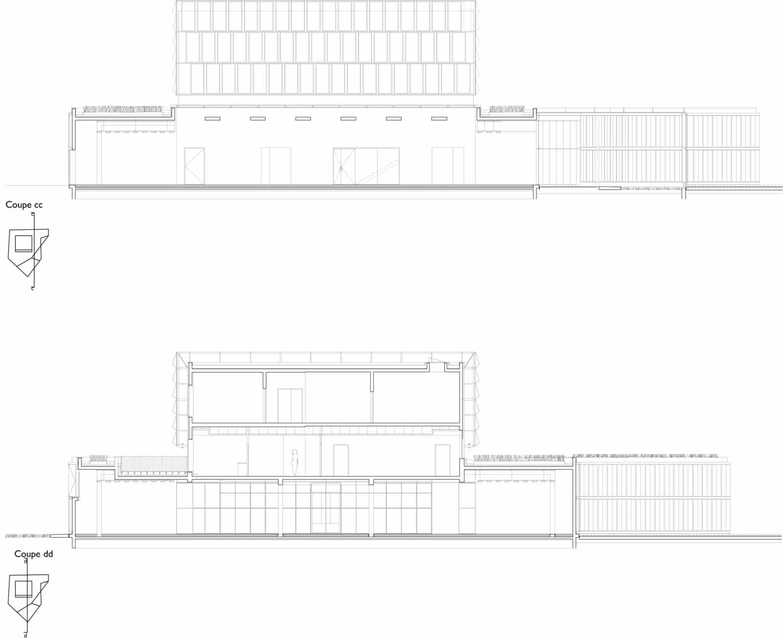 Le bâtiment est constitué de deux corps. Le premier cubique, sur une base de trois travées de côté et de trois niveaux accueille a sa base l’ensemble des rayons dits documentaires et les romans, autrement dits les livres qui se rangent de manière linéaire. Ses deux niveaux supérieurs hébergent l’administration et la salle de conférence de double hauteur. Le volume se clos d’une cinquième façade végétale. Ce choix résulte de sa forte exposition des logements alentours, il vise à adoucir la vue.