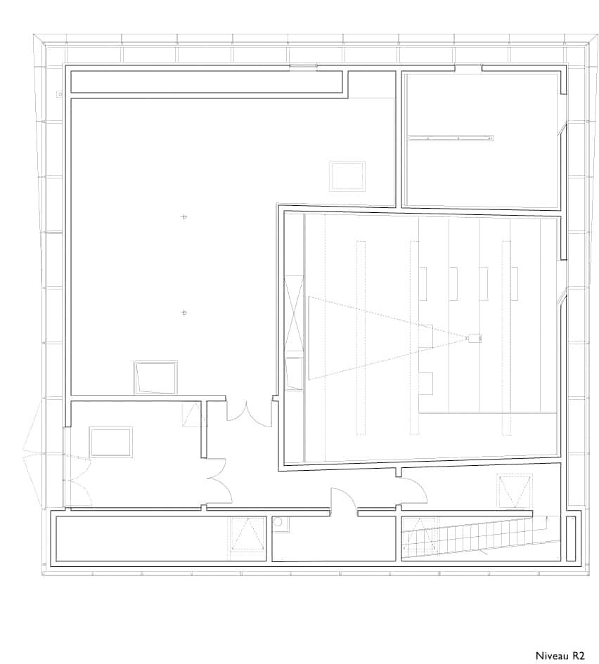Le second corps se greffe au premier en épousant l’enceinte du projet. Il constitue un espace tampon entre le cœur du projet et l’espace public. Une entaille s’effectue entre les deux corps, comblé par du verre, elle permet d’arroser les rayons de lumière naturelle mais également de définir deux lieux de consultations. Les rayons plus attractifs (bandes dessinées, presse, vidéo) qui nécessitent un rangement autre que le rayonnage se situent autour du patio. Cet espace est ponctuellement ouvert sur l’espace public à travers des baies où le manteau aluminium vient s’entrouvrir sur lui-même. De l’intérieur, il n’est visible qu’un voile de béton banché percé de baies vitrées.