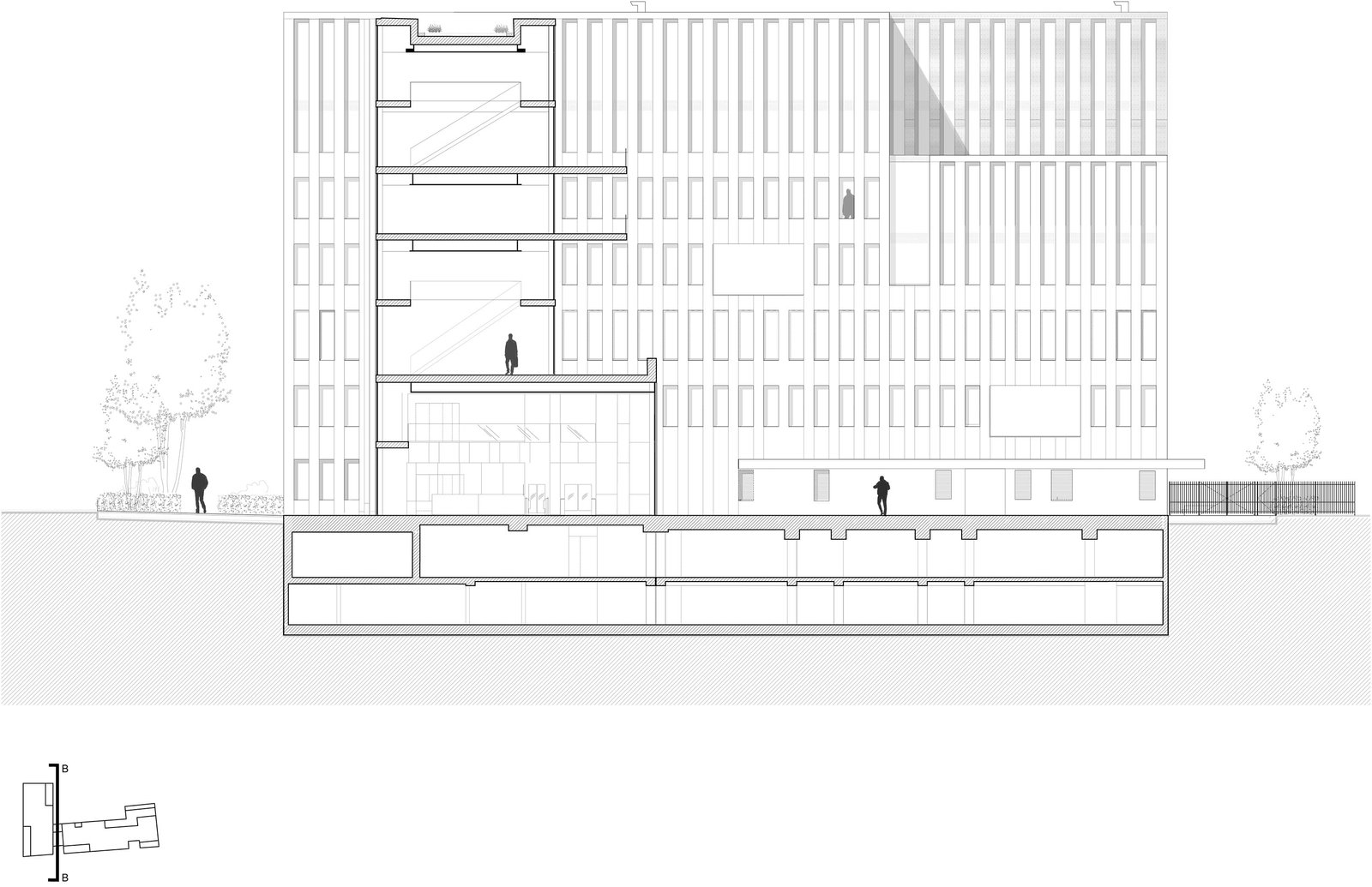 Les architectes d’AFAA Architecture commentent : « Nous avons volontairement limité le nombre de matériaux de façade utilisés afin de concevoir une architecture sobre et maîtrisée». Afin de casser la rigueur de la trame, celle-ci est ponctuellement perforée par de généreuses baies. De plus, avec un peu d’attention, on remarque que la trame n’est pas aussi rigide que cela, elle joue en effet sur différentes largeurs de baies et joue sur les lignes de la terre cuite afin de casser la monotonie.
