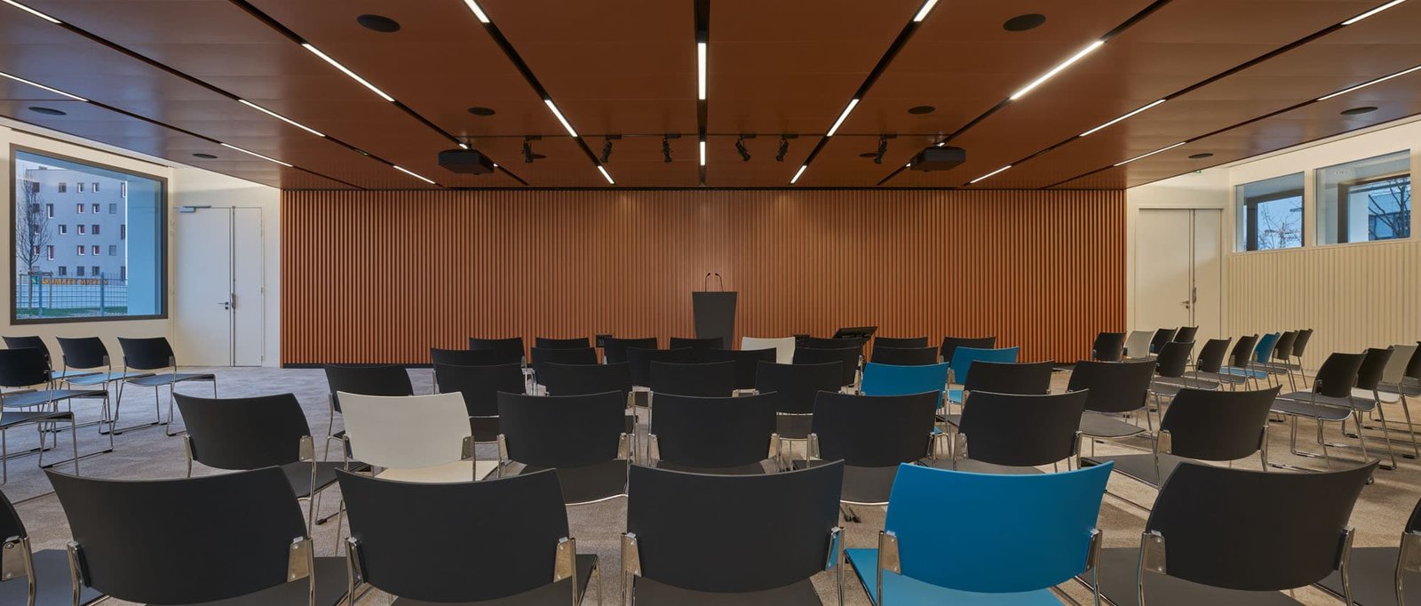 Derrière le vitrage des baies, se cache des éléments clefs du programme comme le restaurant, l’espace de formation ou la place du village. Les terrasses sont quant à elles revêtues de cassettes métalliques de teinte cuivrée, en référence aux câbles de cuivre utilisés dans l’électricité.