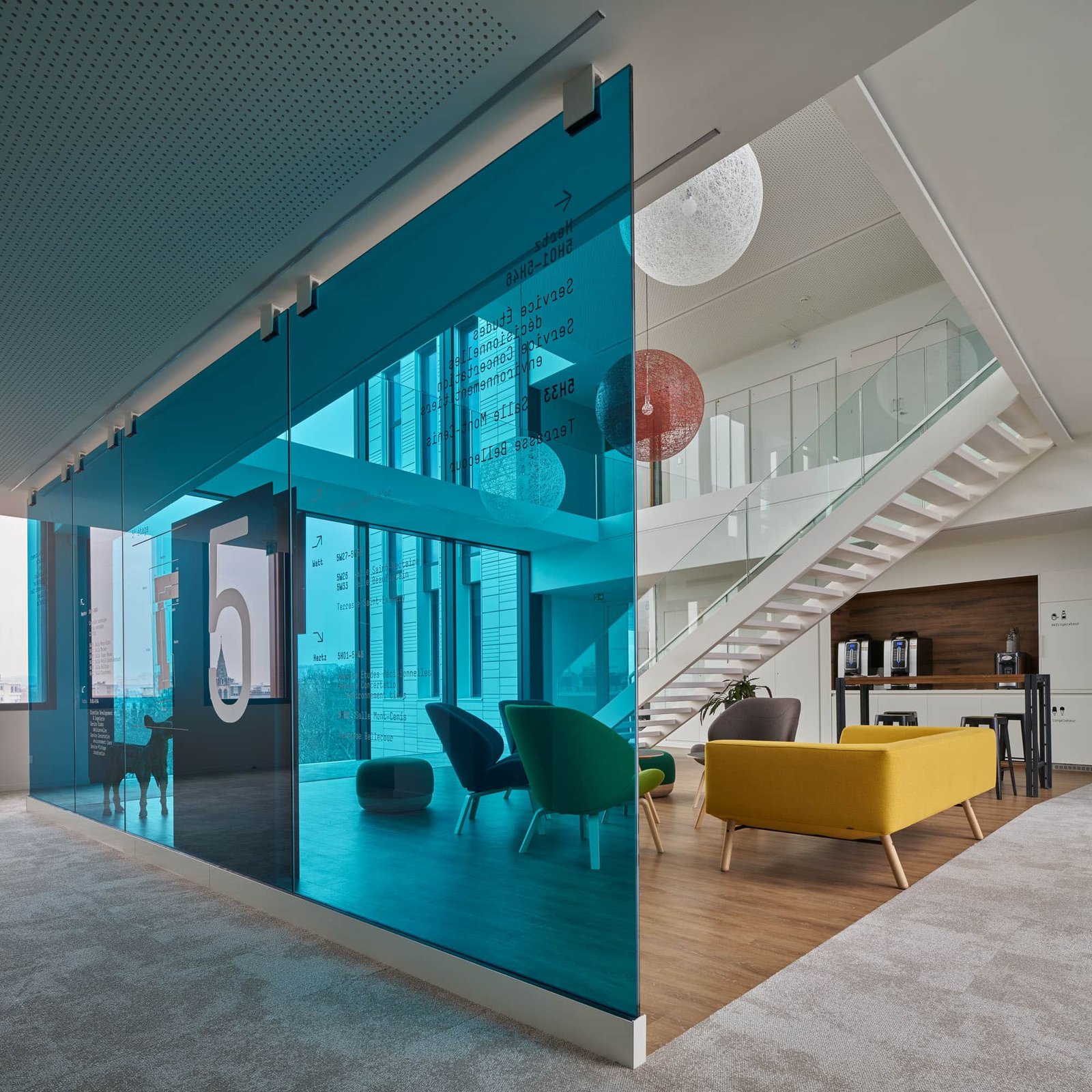 Parmi les contraintes de l’entreprise, on relèvera le besoin de sécurité, mais aussi la facilité d’accès des différents espaces de l’immeuble ayant des niveaux de sécurités différents. Du côté de l’image, c’est la volonté de s’ouvrir vers la ville avec plus de transparence sur son activité. Cela se traduit par une organisation en L avec deux ailes qui se rejoignent au sein d’une faille en verre abritant les paliers des circulations.