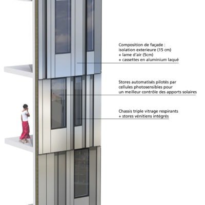De loin le bâtiment se dissimule dans son paysage urbain en adoptant l’altimétrie de ses voisins, la couleur des façades accompagne cette volonté d’intégration. Cependant la présence d’arbres suspendus au-dessus de l’avenue Thiers et l’alternance des panneaux isolants annonce la particularité de ce projet. Une envie des architectes de concevoir les bureaux d’aujourd’hui. Des espaces de travail qui allient le respect de l’environnement et les apports naturels avec le confort de l’usager.