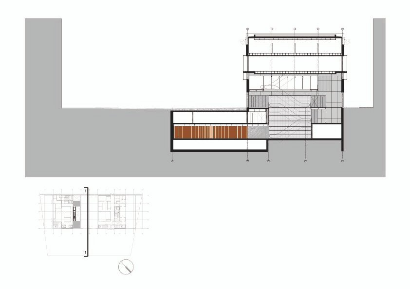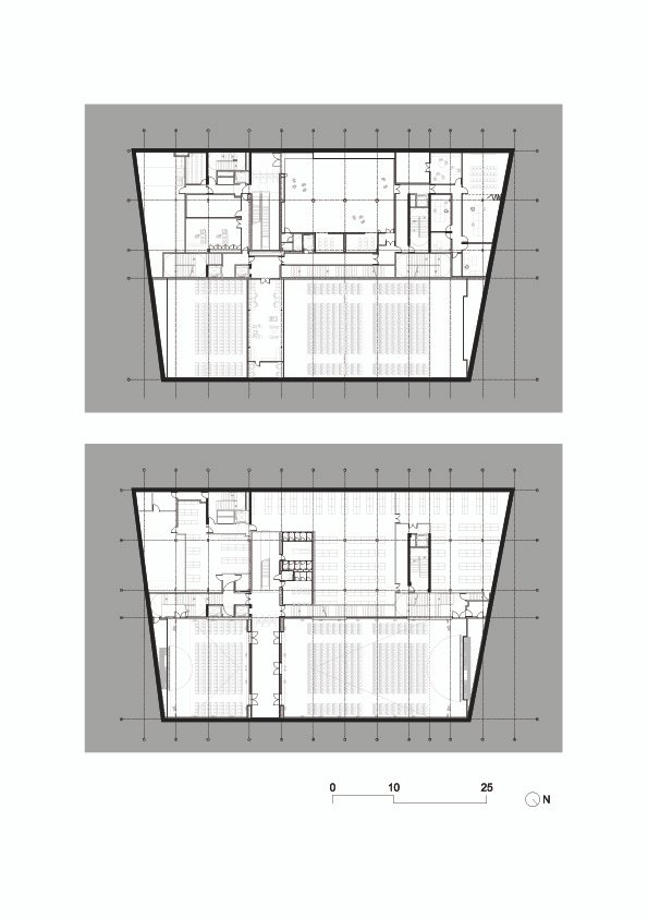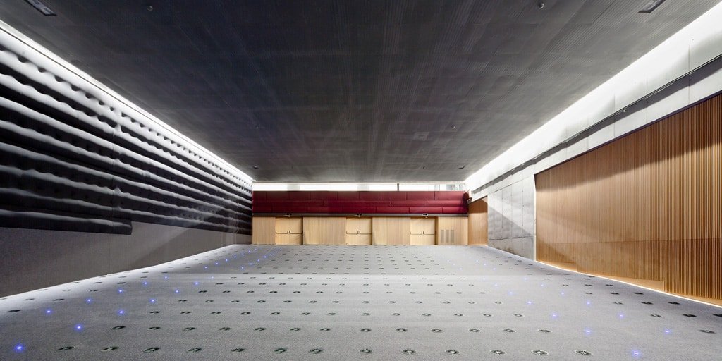 Les deux salles de cinéma se situent au sous-sol et plus précisément sous la place. Il ne faudra donc pas être surpris d’emprunter les escaliers roulants dans le sens descendant pour voir un film. Compte-tenu du programme et de la volonté de ne pas créer un bloc imposant dans le paysage urbain, ce sont donc les salles obscures qui ont été naturellement positionnées en sous-sol. Celui-ci se développe sur trois niveaux, il renferme les archives du centre.