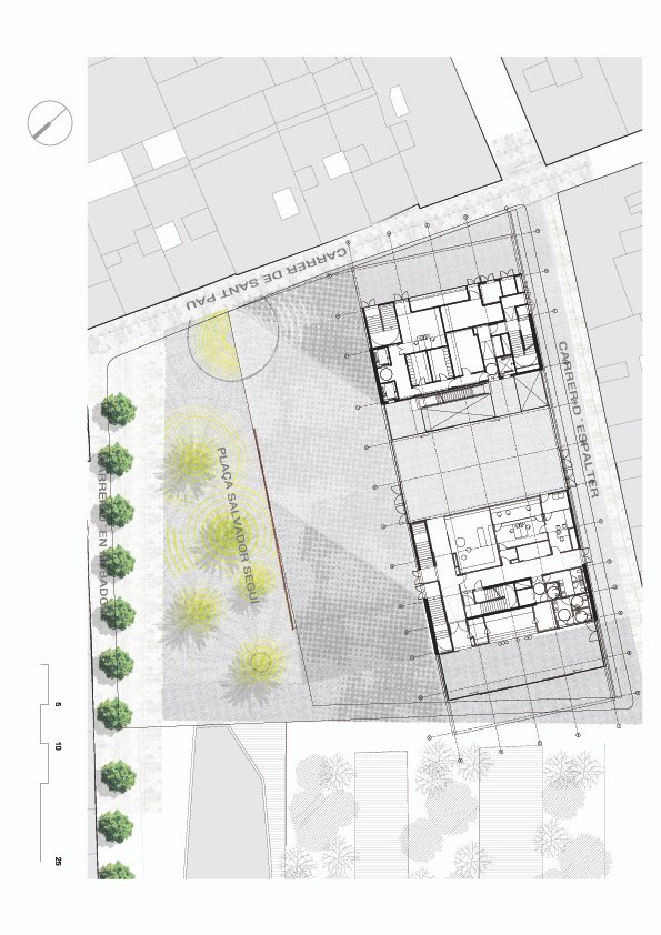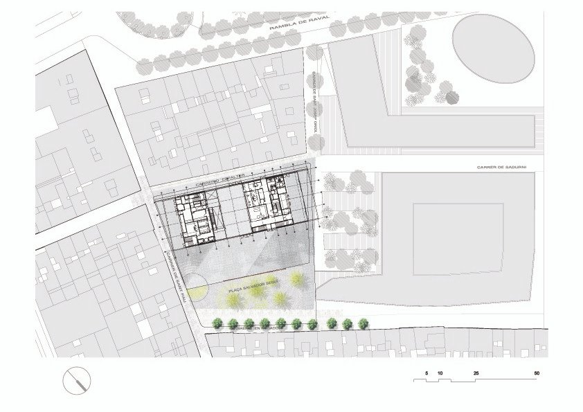 Le site est proche du Carrer de Robador, dans un quartier populaire en réhabilitation. Le bâtiment a la chance de côtoyer une place, lieu de rencontre et d’évènements. Le centre intègre le décor de la scène du marché avec un RDC proposant divers services pour le public, le bâtiment épouse la rue carrero espalter assurant une continuité des façades de la rue.