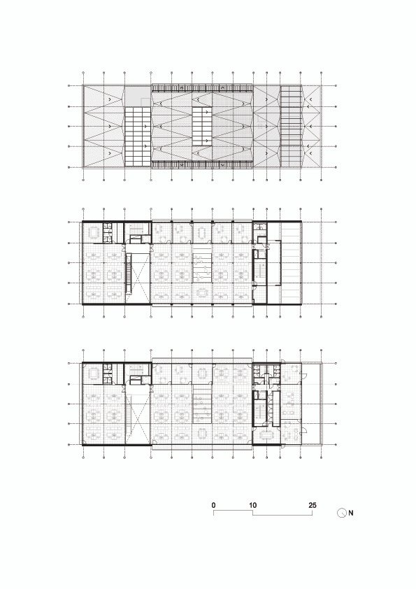 La partie administrative se situe aux étages du bâtiment, elle est séparée des cinémas par l’espace public qui inclut le guichet, des espaces d’expositions, un café. Ces niveaux sont particulièrement transparents, seules les teintes des cloisons de verre permettent de délimiter les espaces de la médiathèque au premier étage. Cette médiathèque est en quelque sorte une place ouverte sur la place. Comme pour la Factory à Boulogne-Bilancourt, Josep Lluís Mateo s’astreint au maximum de l’utilisation de poteaux, les plateaux sont véritablement modulables.