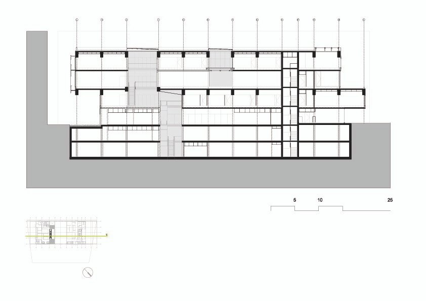 Dans la vielle ville, mon bâtiment s’expose à s’exprimer en tant qu’une pure structure, pas de bardages, pas de finitions. Les poteaux-poutres-murs en béton brut qui forment les façades sont très variés, prouvant qu’ils sont de la même familles que les murs délabrés voisins, où l’enduit extérieur s’effrite pour révéler la masse porteuse originale des édifices.