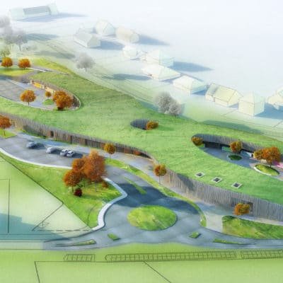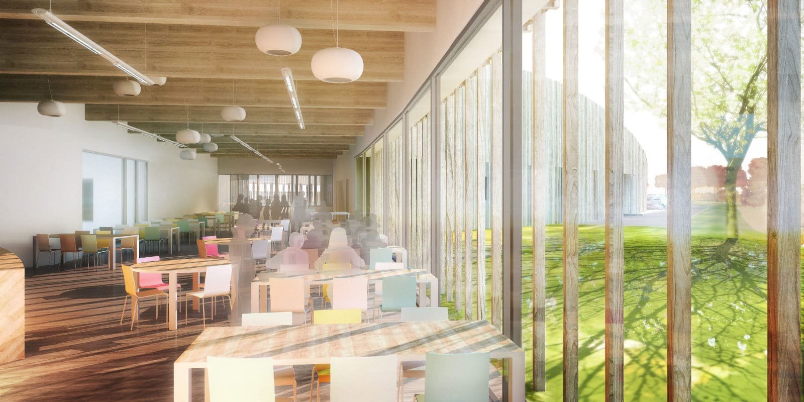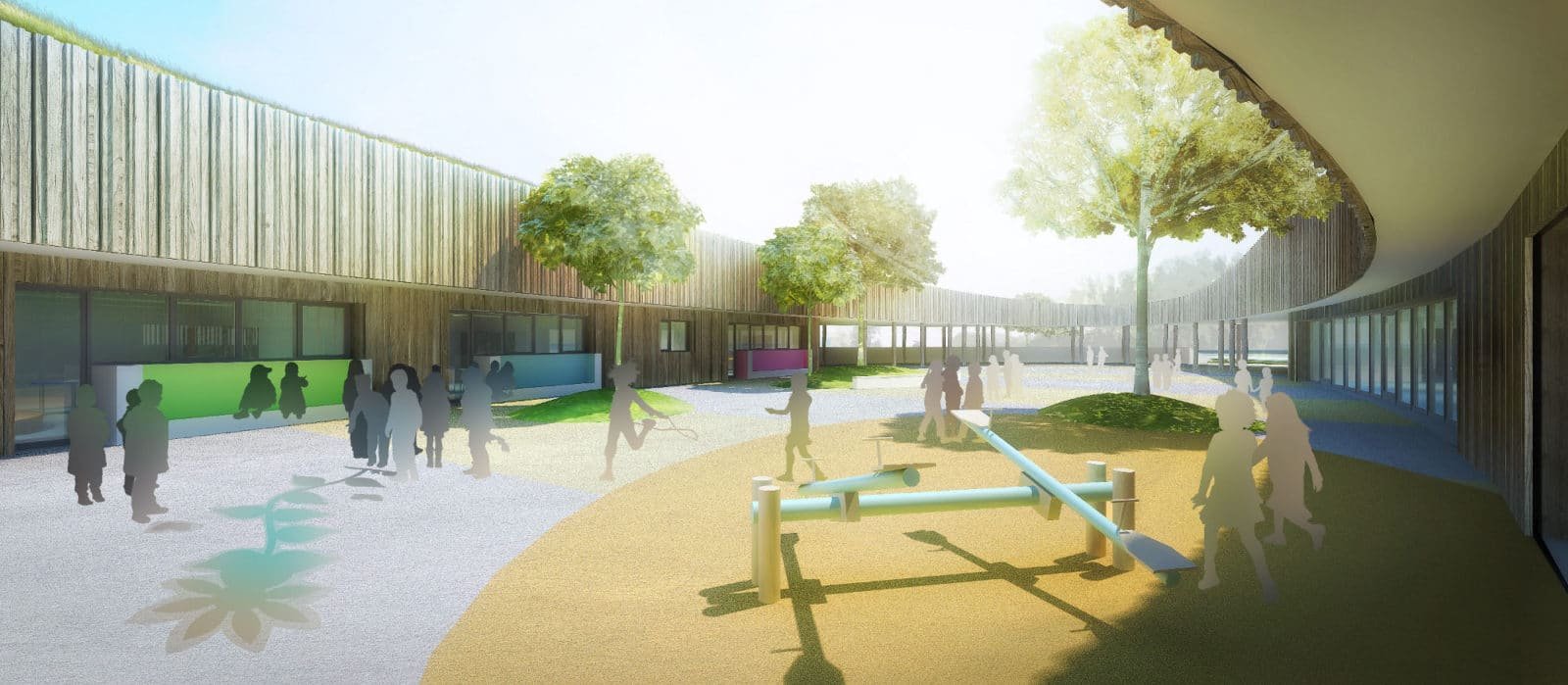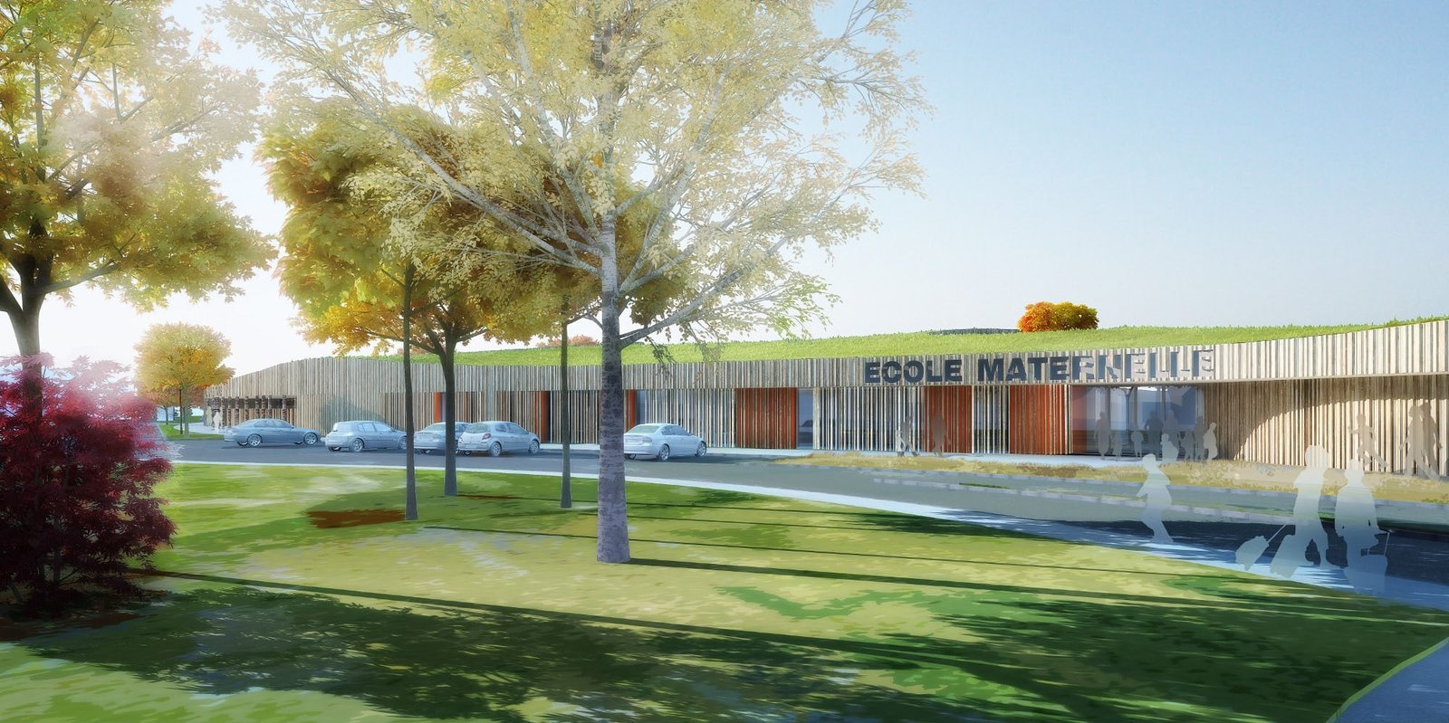 Concernant cette enveloppe, les architectes ajoutent : « L’emploi de graminées (non allergènes) permet en plus d’apporter une image de « prairie », et de limiter au minimum les entretiens. La maintenance n’est nécessaire qu’une fois par an et aucun arrosage ne sera à prévoir. Pour le bardage, il nous est apparu évident de proposer un matériau robuste mais véhiculant une « légèreté » esthétique. Nous proposons l’utilisation de panneaux de bois lamellé collé non raboté, les panneaux donnant sur le parvis présentent un relief (jeux d’ombre) ».