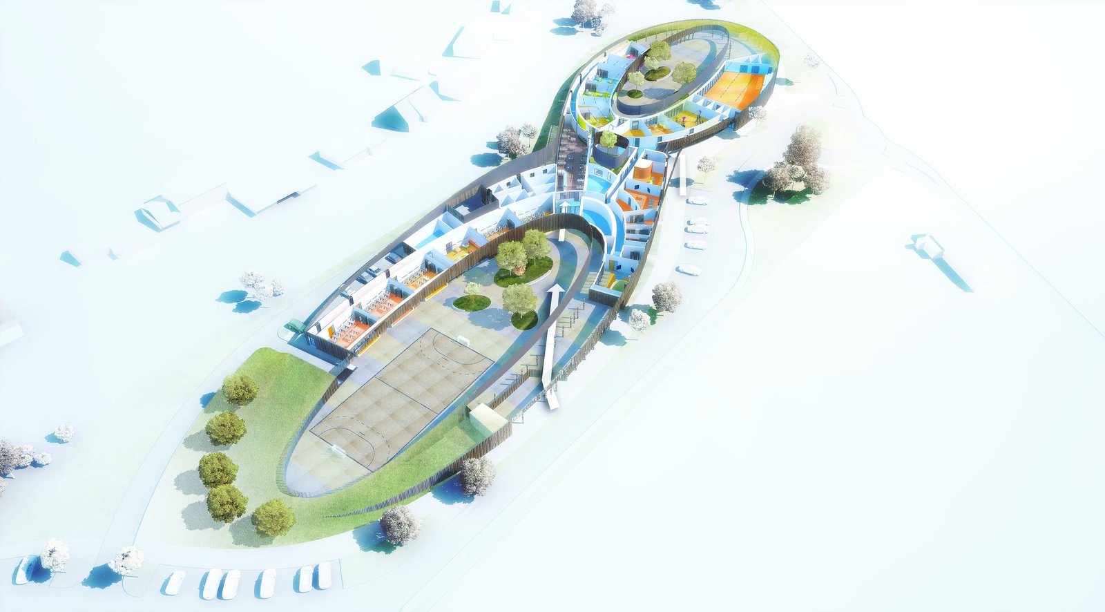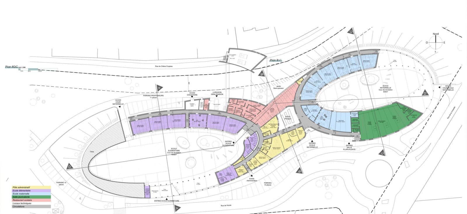 Le bâtiment regroupe l’ensemble du programme au sein d’un seul geste architectural. Les architectes invitent les enfants à plonger dans un grand huit de l’enseignement. Un chiffre dont l’organisation peut être décrit de la manière suivante. Chaque ellipse est dédiée à une école, l’école maternelle à l’est, rue de la Croisette et l’école primaire à l’ouest, face à la nouvelle déserte.