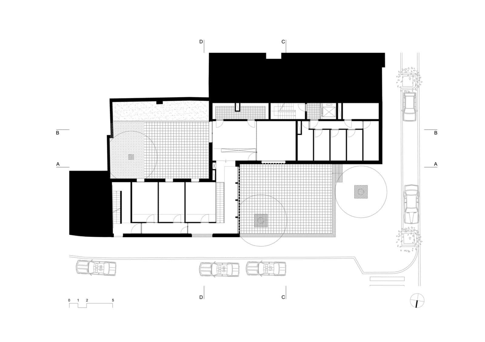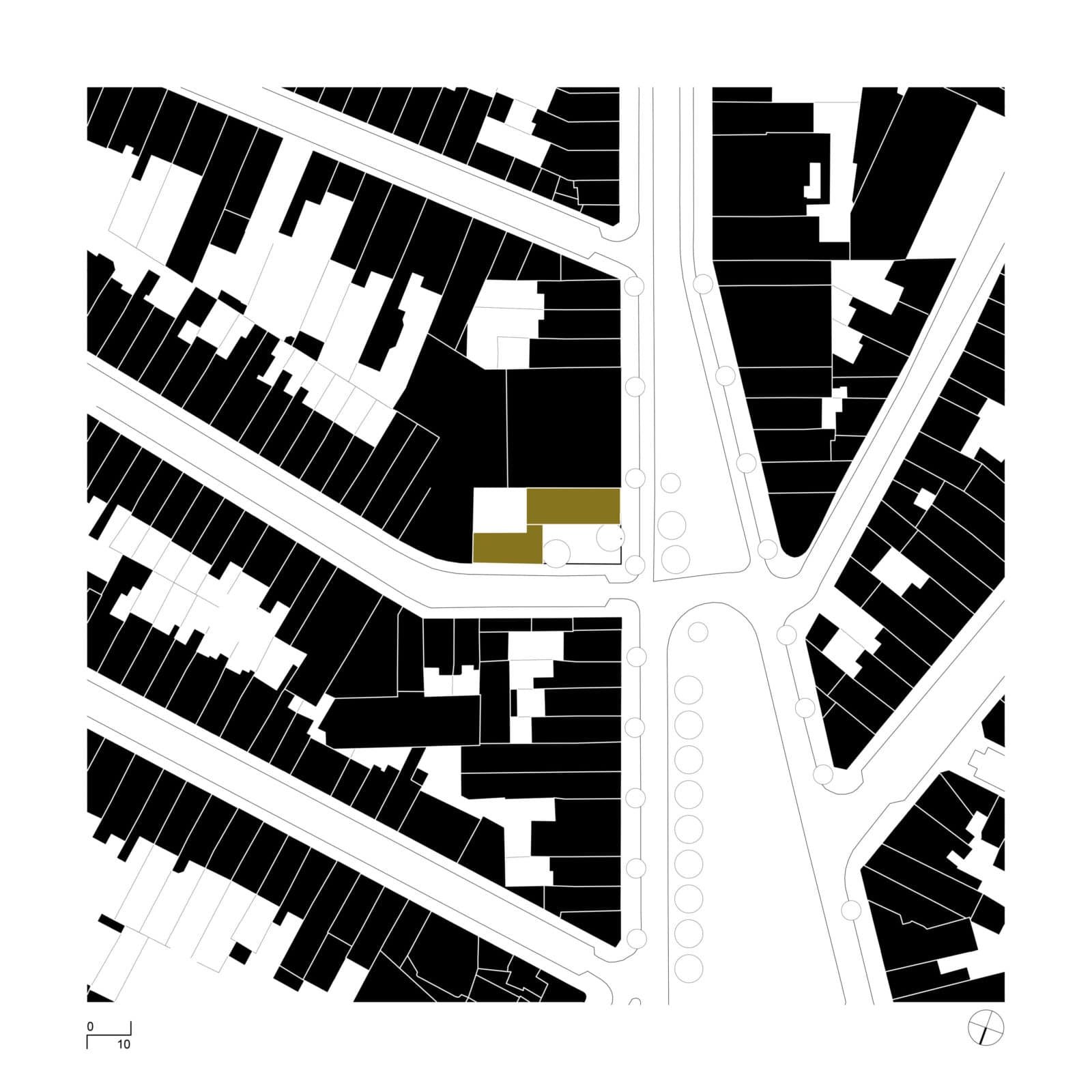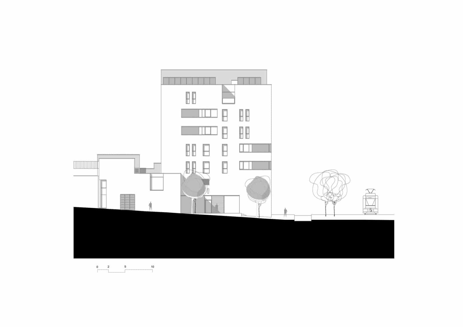 Olivier Dubucq : Comme je le disais, il faut se rappeler qu’il s’agit bien d’un “Koban” c’est-à-dire d’un lieu plutôt de dialogue et de médiation plutôt que de répression. Il nous semblait donc important d’ouvrir l’espace public pour donner un lieu tranquille en marge de la place Liedts très animée et en contact avec le commissariat, par une transition d’un trottoir généreux vers son parvis. Néanmoins, les entrées sont bien distinctes : le commissariat a son parvis, les logements leur adresse à rue. Les éléments sont imbriqués, les rapports sont induits mais non forcés : ils “cohabitent” comme vous dites. En outre, la topographie et la lumière jouent un rôle important : l’ensemble des fonctions publiques commissariat est de plain pied avec son parvis. Nous avons cherché à amener un maximum de lumière en intérieur d’îlot non seulement pour le bénéfice des logements mais aussi pour signifier cette continuité d’espace public au rez-de-chaussée, dans le prolongement du parvis. L’entrée des logements est elle au niveau de la rue des Palais : bien qu’un contact visuel soit possible, le niveau de l’entrée est plus basse que celui du parvis, marquant un frontière, même si elle est “poreuse”.