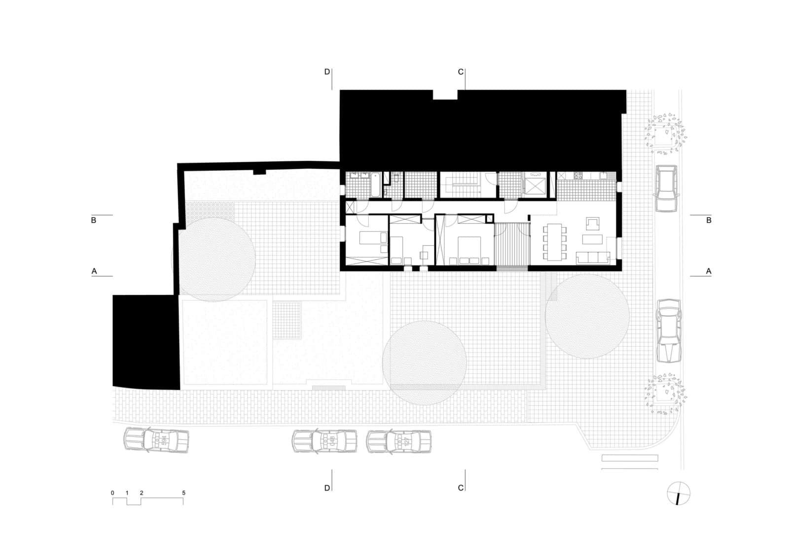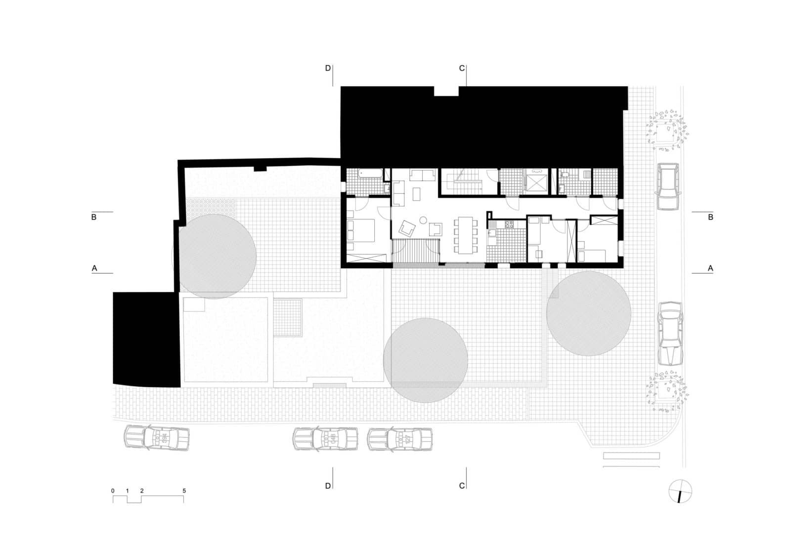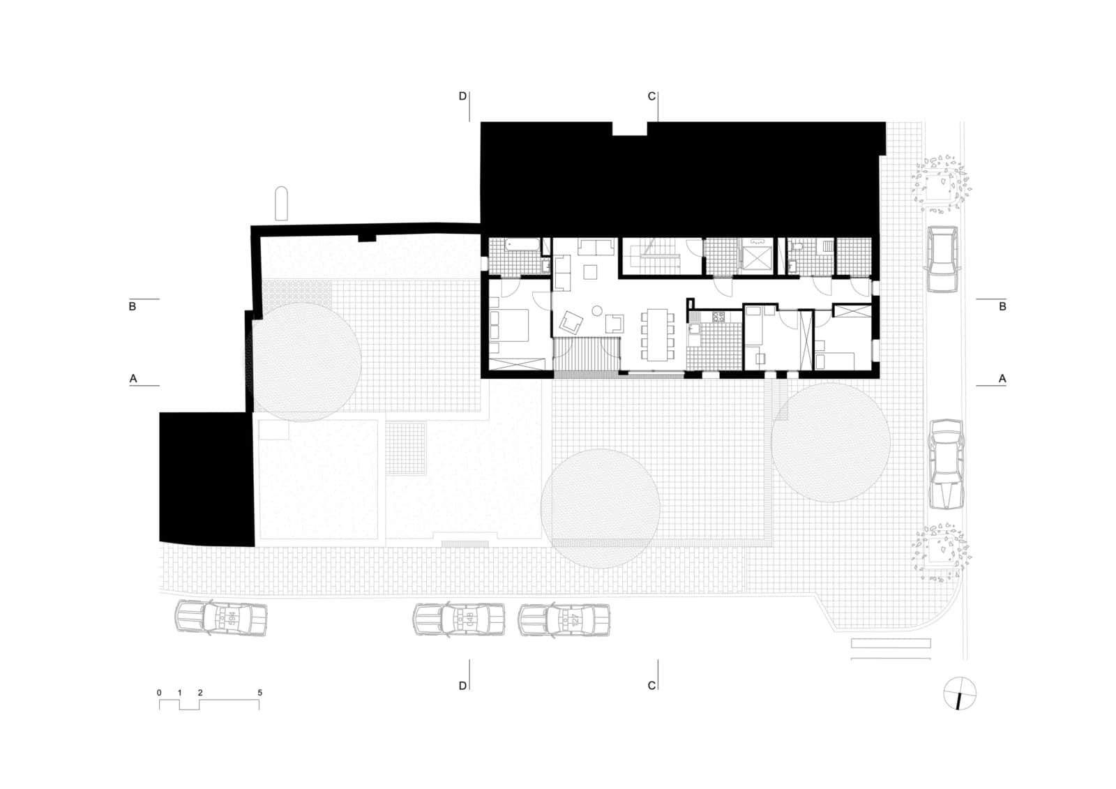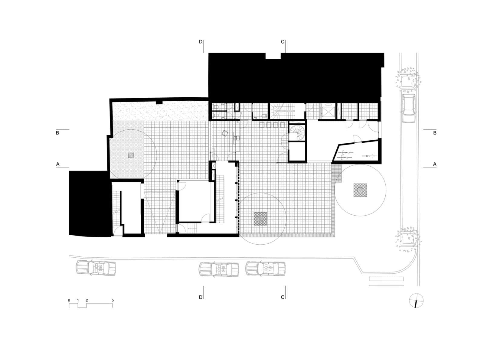 Olivier Dubucq : Comme je le disais, il faut se rappeler qu’il s’agit bien d’un “Koban” c’est-à-dire d’un lieu plutôt de dialogue et de médiation plutôt que de répression. Il nous semblait donc important d’ouvrir l’espace public pour donner un lieu tranquille en marge de la place Liedts très animée et en contact avec le commissariat, par une transition d’un trottoir généreux vers son parvis. Néanmoins, les entrées sont bien distinctes : le commissariat a son parvis, les logements leur adresse à rue. Les éléments sont imbriqués, les rapports sont induits mais non forcés : ils “cohabitent” comme vous dites. En outre, la topographie et la lumière jouent un rôle important : l’ensemble des fonctions publiques commissariat est de plain pied avec son parvis. Nous avons cherché à amener un maximum de lumière en intérieur d’îlot non seulement pour le bénéfice des logements mais aussi pour signifier cette continuité d’espace public au rez-de-chaussée, dans le prolongement du parvis. L’entrée des logements est elle au niveau de la rue des Palais : bien qu’un contact visuel soit possible, le niveau de l’entrée est plus basse que celui du parvis, marquant un frontière, même si elle est “poreuse”.