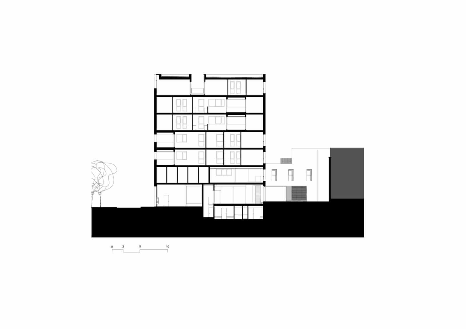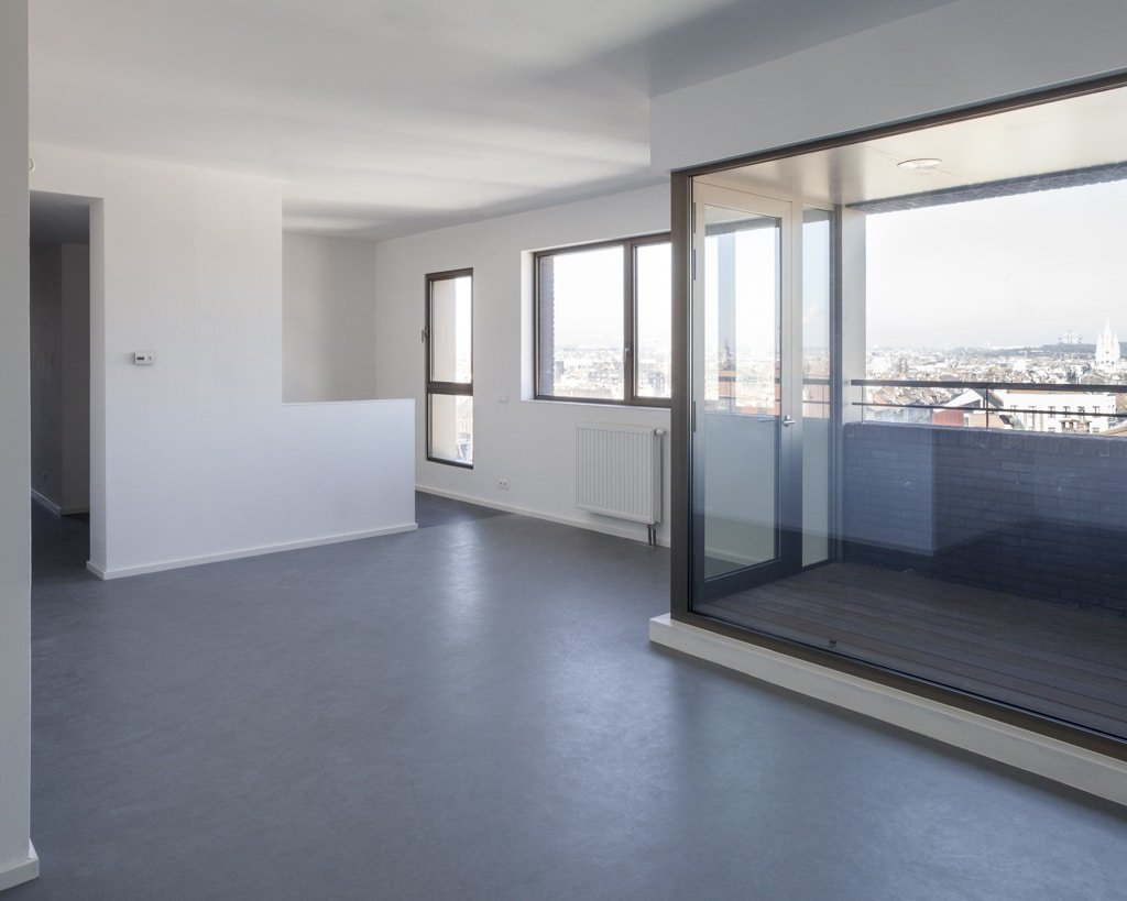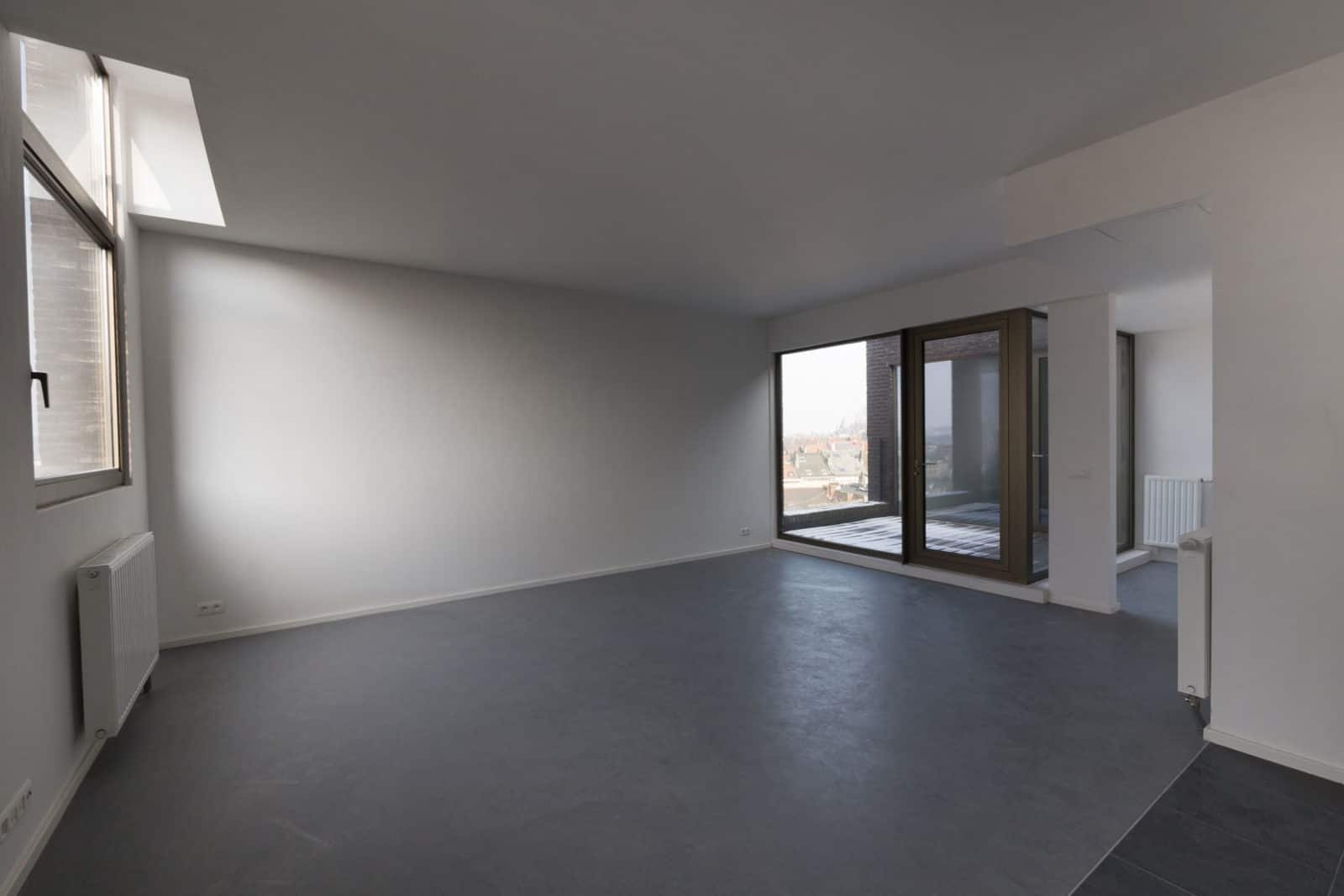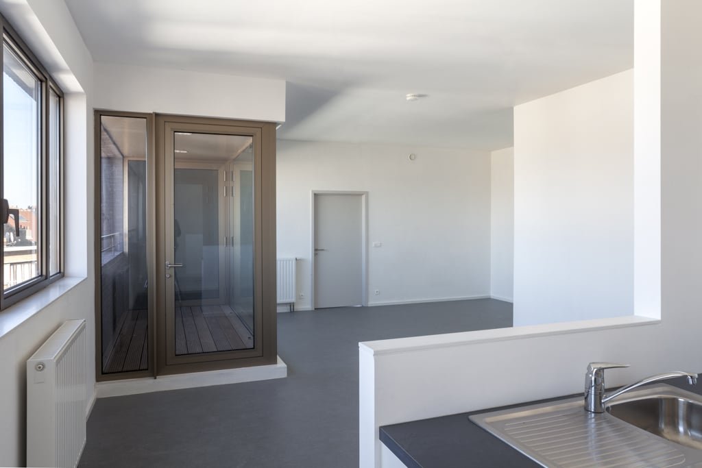 Olivier Dubucq : Extrèmement stimulante ! C’est une chance de pouvoir travailler un coin comme articulation urbaine et c’est bien pour cela que nous l’avons saisie en mettant en oeuvre cette transition (élargissement du trottoir et parvis). Le jeu des terrasses des appartements témoignent aussi de cette transition : les 2 premières sont nettement plus en rapport avec la place Liedts de par leur hauteur, alors que les 2 terrasses des R+4 et R+5 peuvent pleinement profiter de la vue extraordinaire sur la ville et ses alentours, la terrasse du dernier étage quant à elle joue à la fois avec la vue et le rapport au ciel. La position de coin et la topographie naturelle ont impliqué la typologie du bâtiment.
