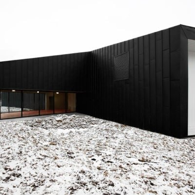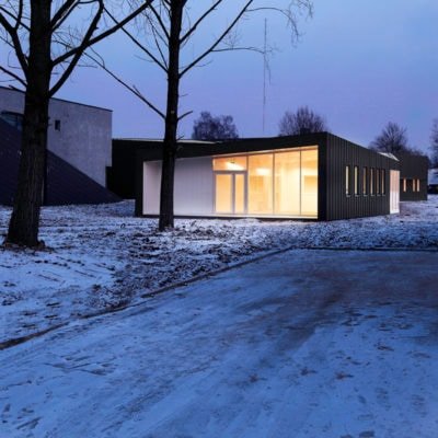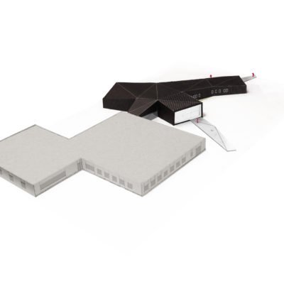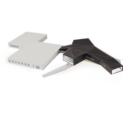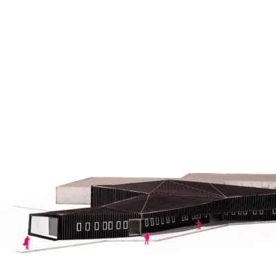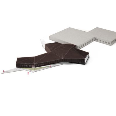 Les buttes de terre environnantes sont redressées et géométrisées à l’image de la toiture végétalisée du bâtiment. Sous cette toiture, les façades, constitués de panneaux en zinc anthracite qui se plient et se déplient, traduisant le trouble qui existe ici entre paysage et architecture.