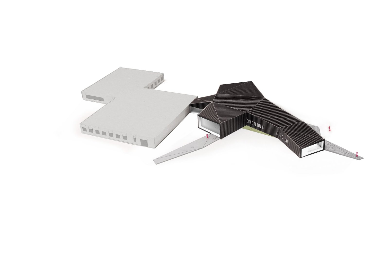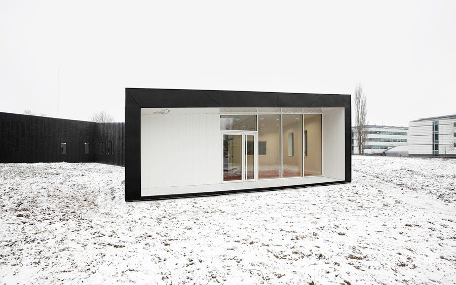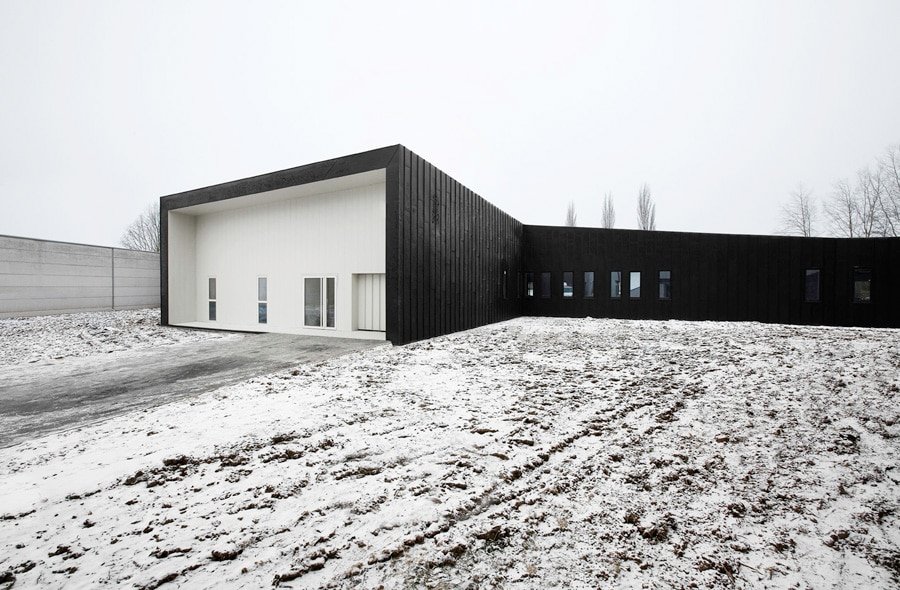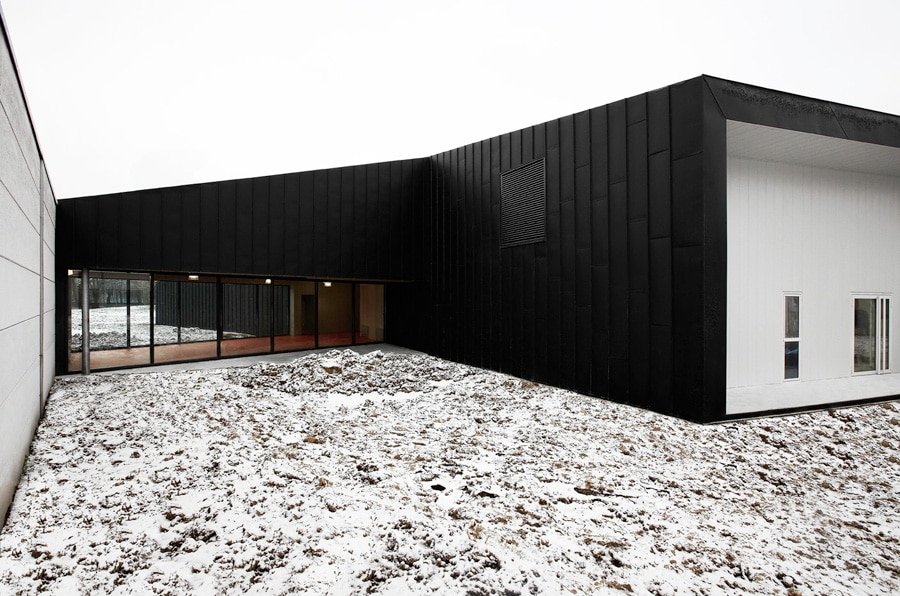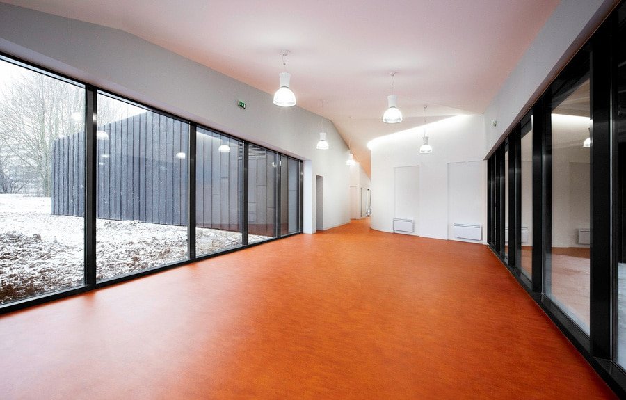 Les buttes de terre environnantes sont redressées et géométrisées à l’image de la toiture végétalisée du bâtiment. Sous cette toiture, les façades, constitués de panneaux en zinc anthracite qui se plient et se déplient, traduisant le trouble qui existe ici entre paysage et architecture.