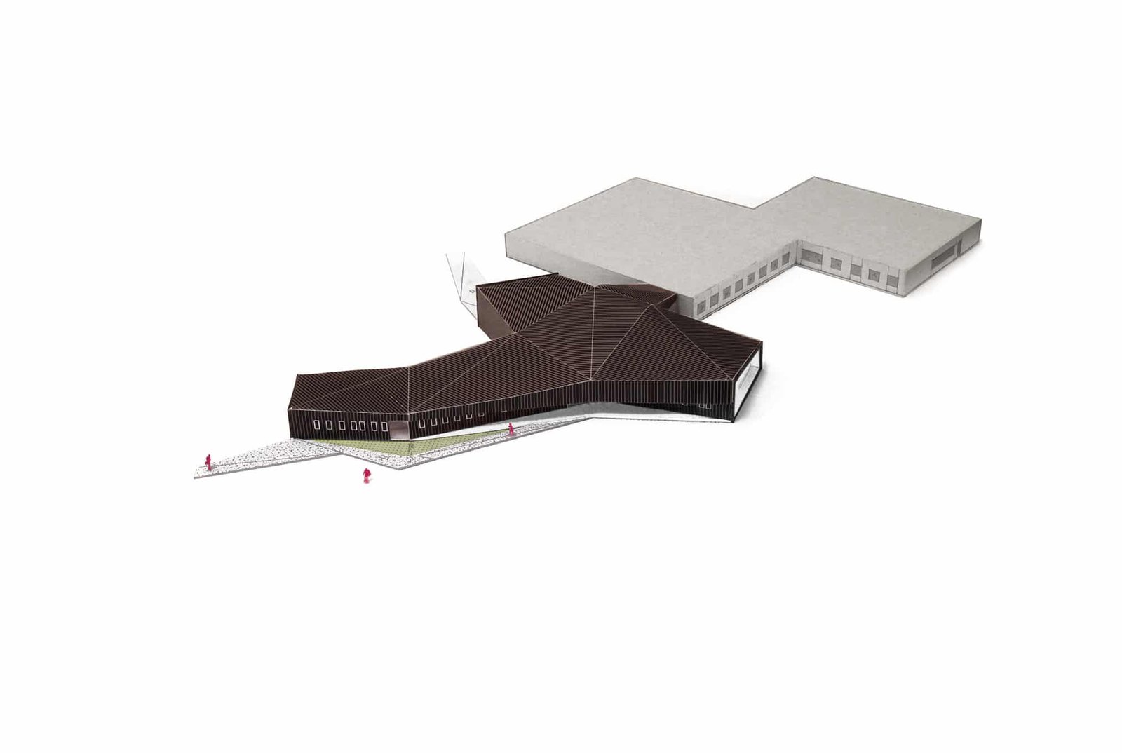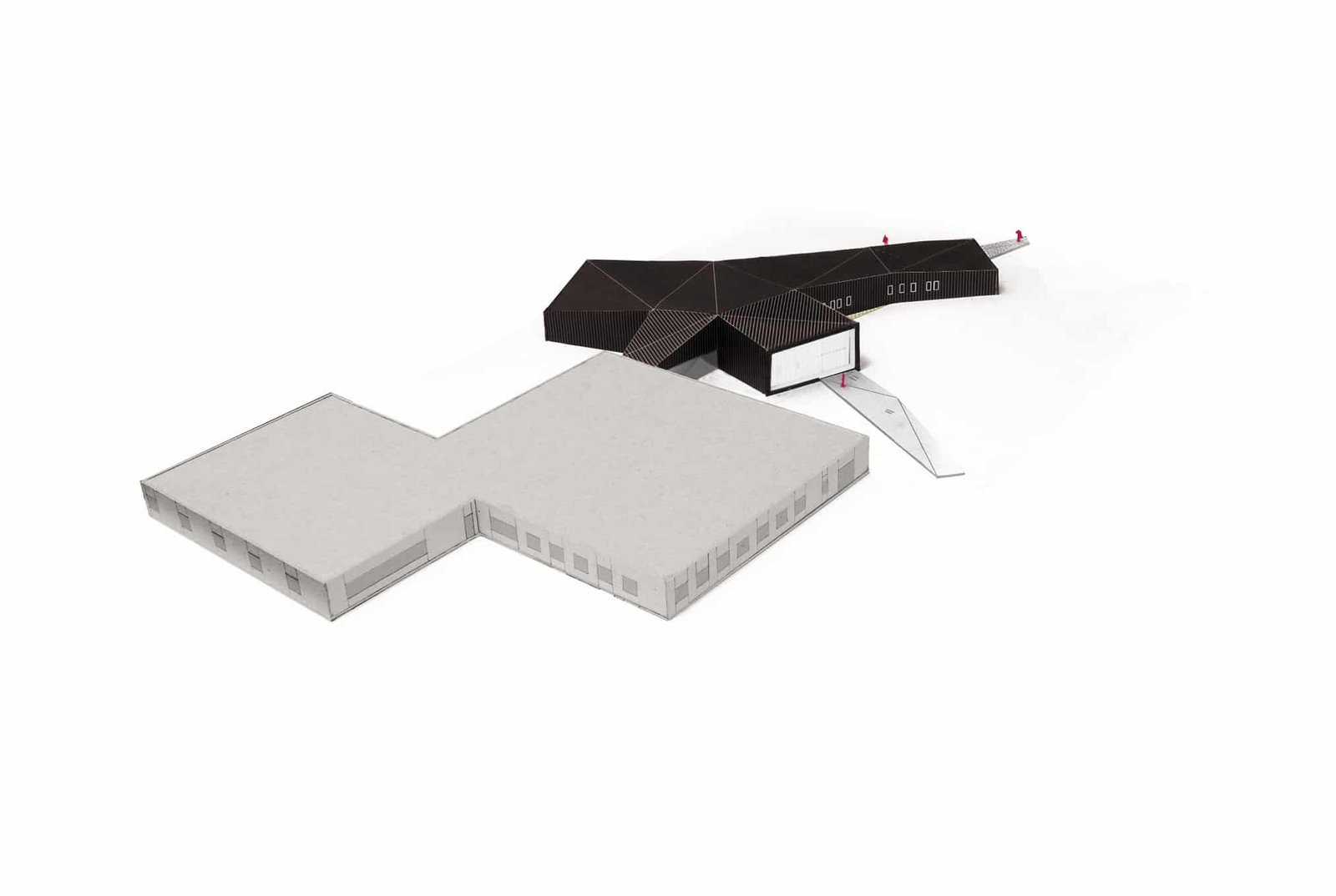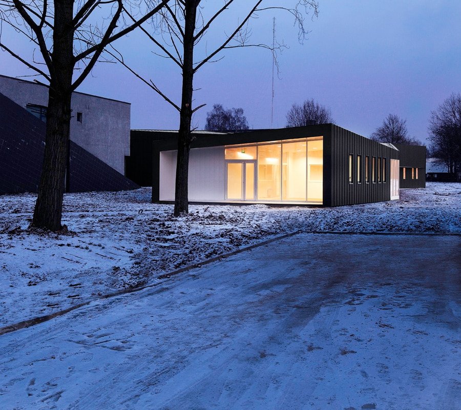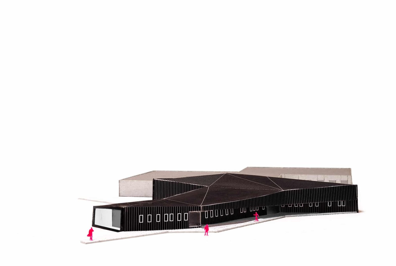 Les buttes de terre environnantes sont redressées et géométrisées à l’image de la toiture végétalisée du bâtiment. Sous cette toiture, les façades, constitués de panneaux en zinc anthracite qui se plient et se déplient, traduisant le trouble qui existe ici entre paysage et architecture.