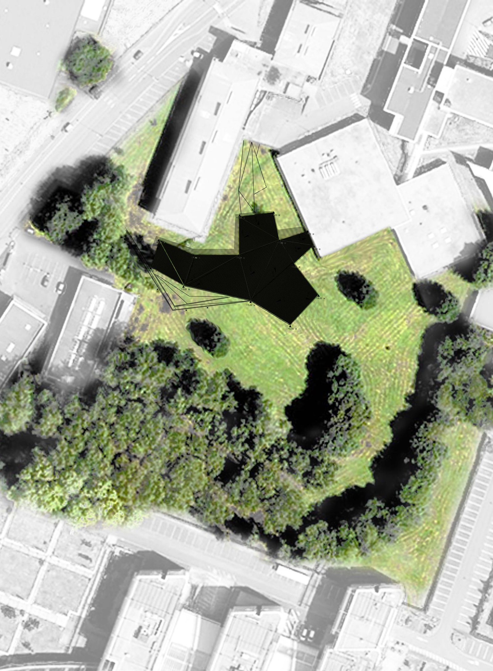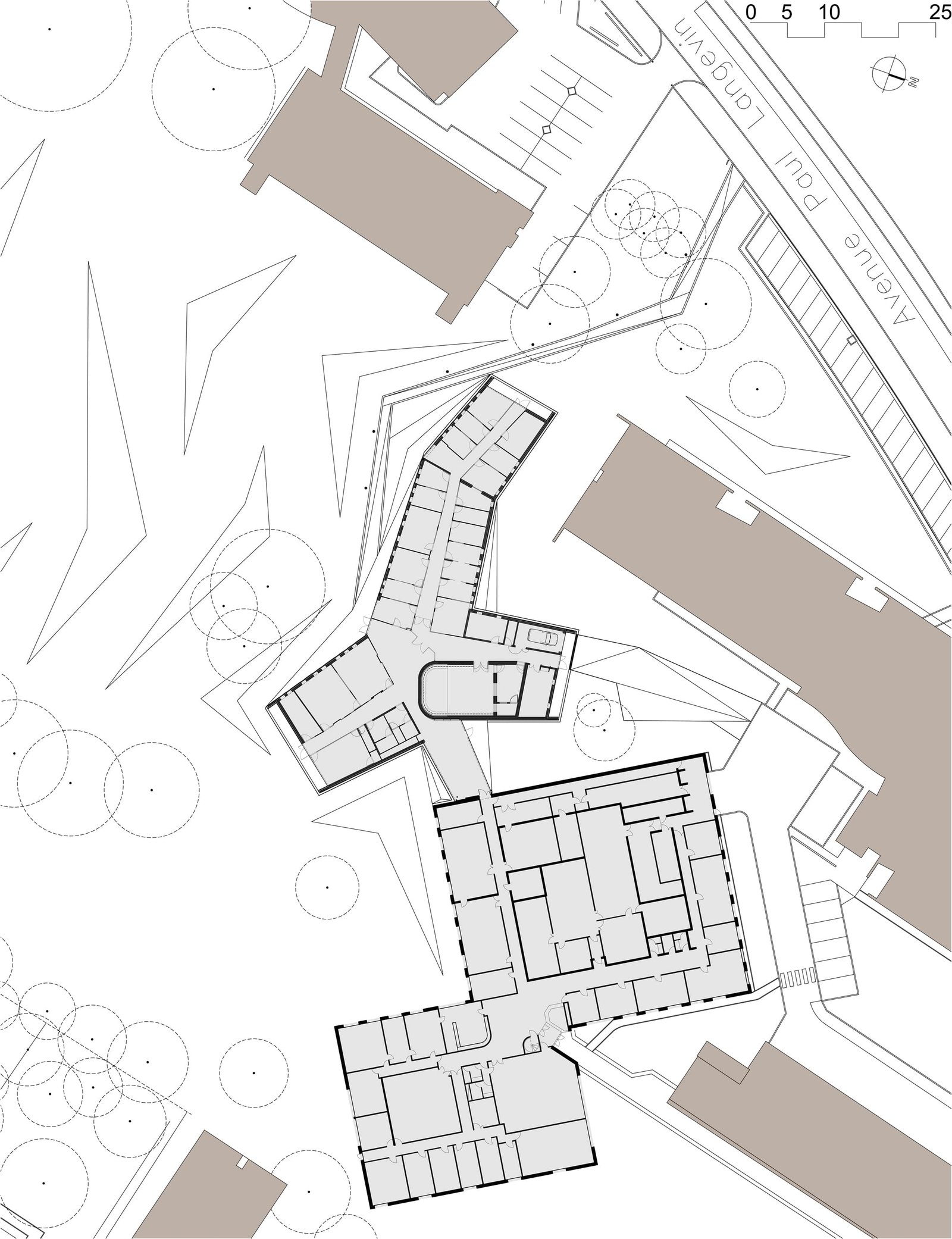 Au niveau de l’intégration, plutôt que tenter toute urbanité d’îlot, les architectes ont choisi de respecter l’intégrité initiale du projet d’aménagement du quartier universitaire en composant un pavillon indépendant intégré au paysage ouvert du campus. Le projet est composé en étoile dont une des branches vient relier un projet typique des années 1980, réalisé comme une galette de brique aux façades indifférenciées.