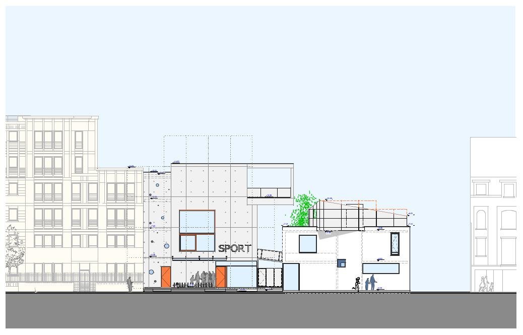 En recul par rapport à l’alignement, mais en raccord avec le voisin, la salle de sport se compose de quatre salles. Au rez, une grande salle omnisport se trouve en fond de parcelle et une petite salle polyvalente donne sur le patio. Aux étages, une grande salle polyvalente donne à la fois sur le canal et sur le patio. Une salle de ping-pong se trouve au dernier niveau. La façade de la salle de sport est divisée en deux parties.