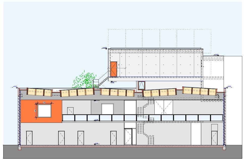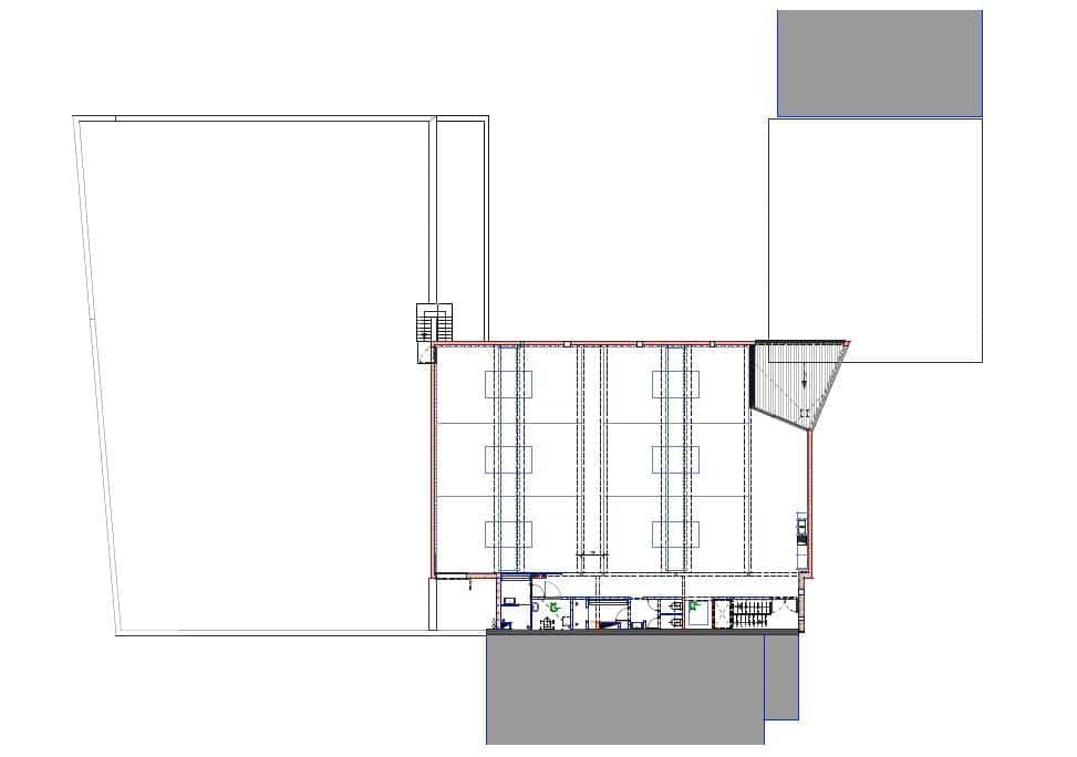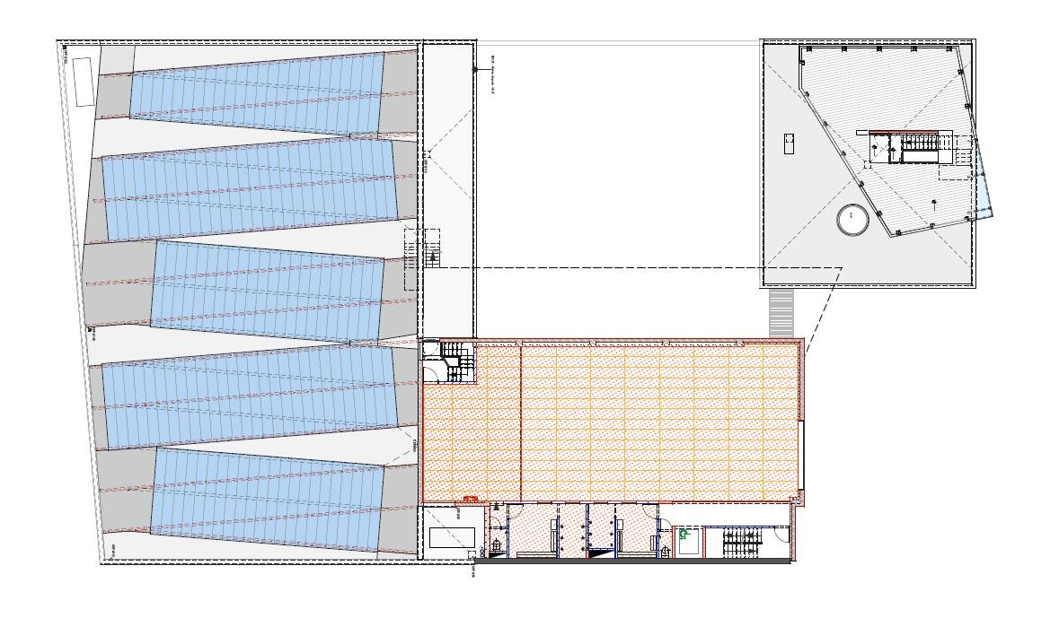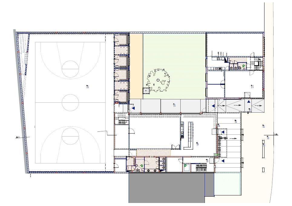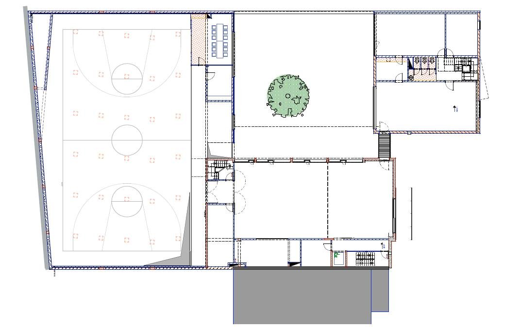 Une bande de service comprenant : les circulations, les vestiaires et les rangements, est adossée au projet voisin et vient articuler le volume principal regroupant l’entrée, la buvette et les différentes salles. Le centre sportif est entièrement accessible aux moins valides. Un ascenseur distribue les différents espaces.