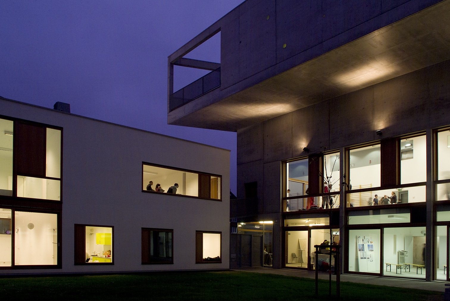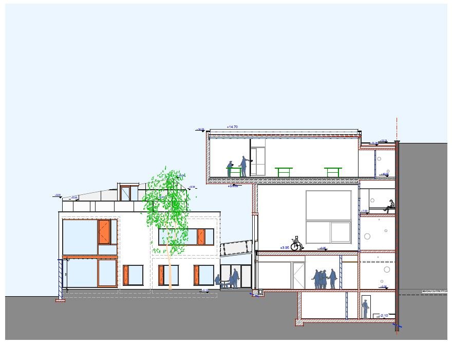 Les deux entités partagent un vaste patio jardin arboré (17x17m). A front de rue se trouve la maison de quartier. Celle-ci s’organise sur deux niveaux. Sa toiture plate sera aménagée pour permettre l’organisation d’activités avec les enfants.