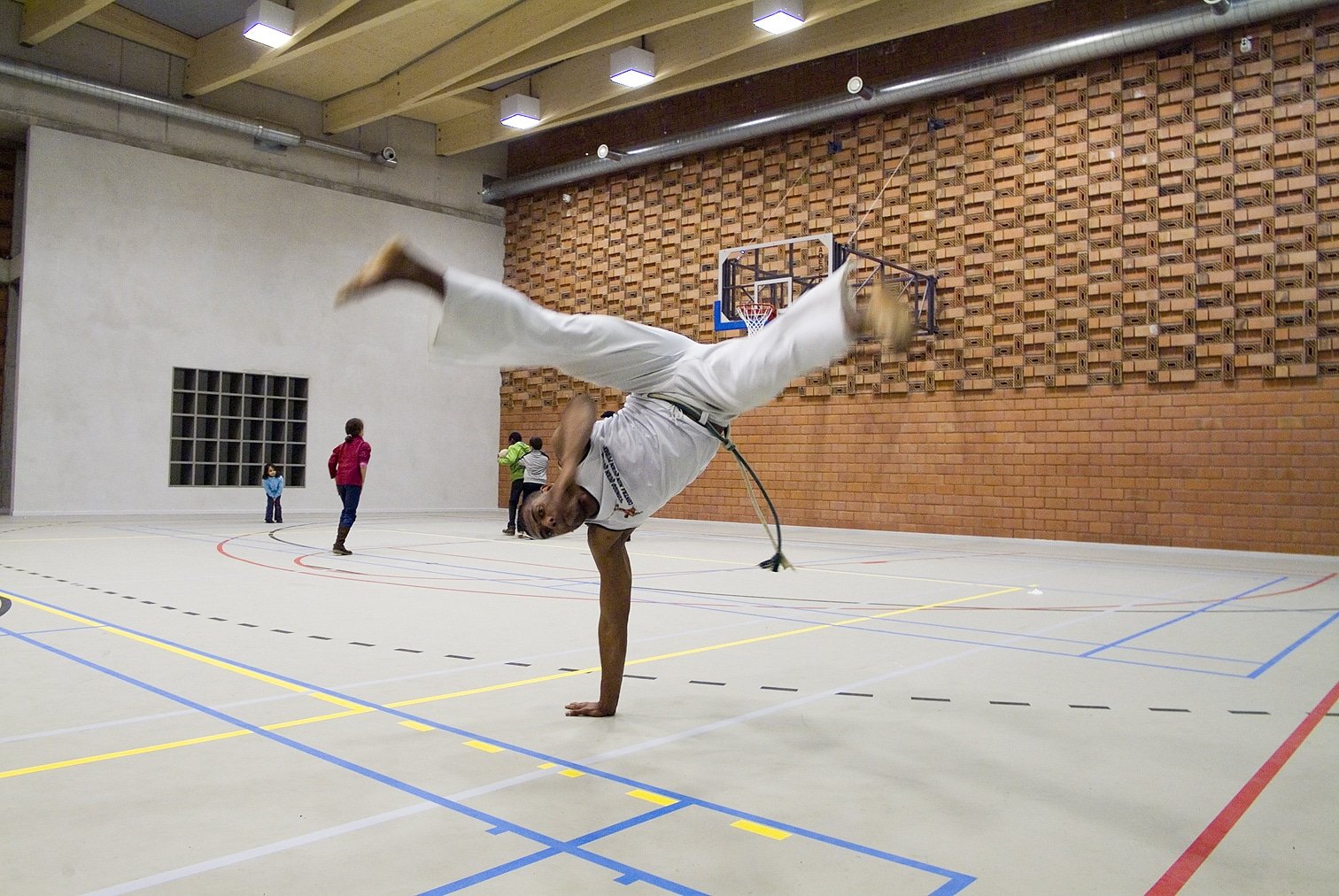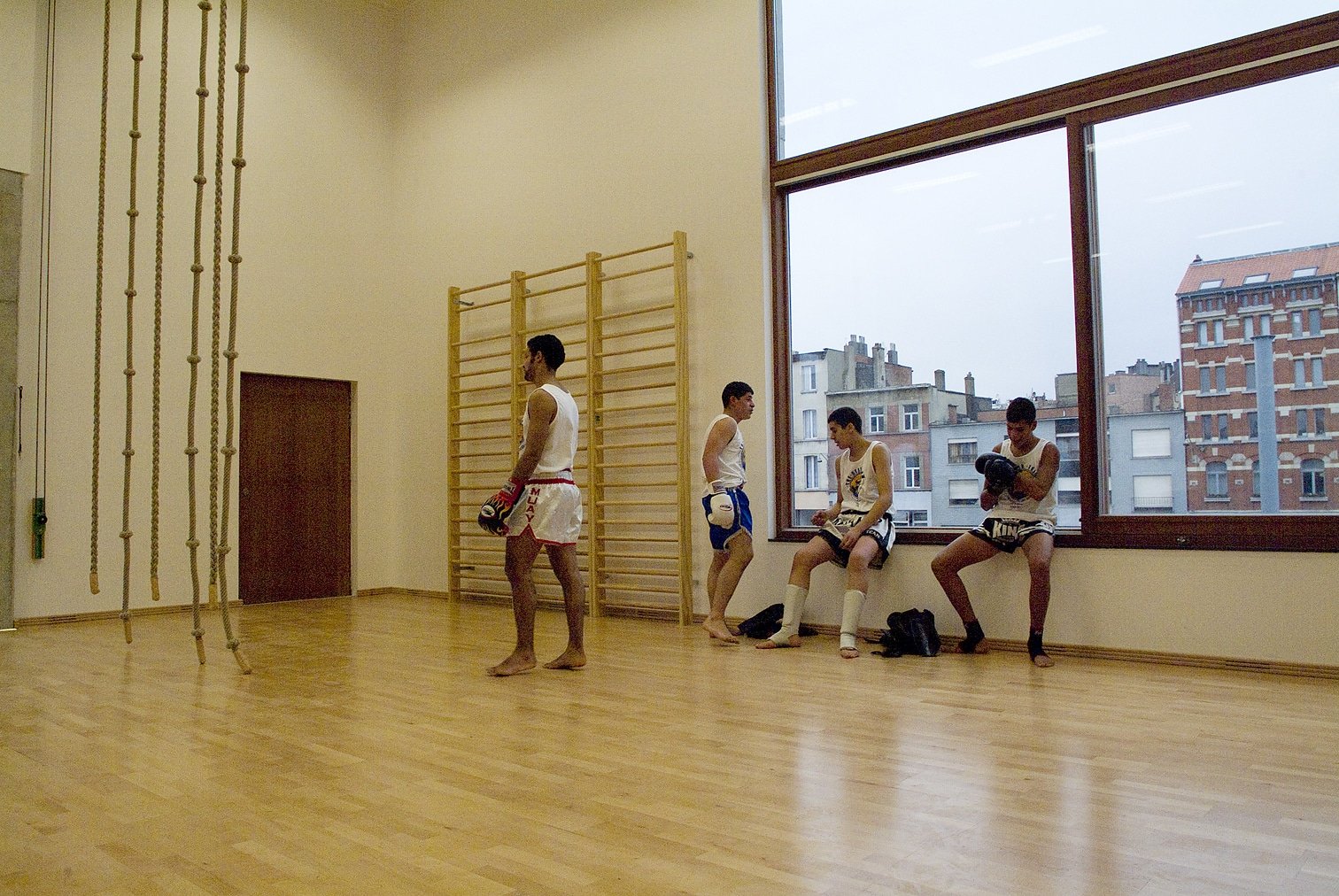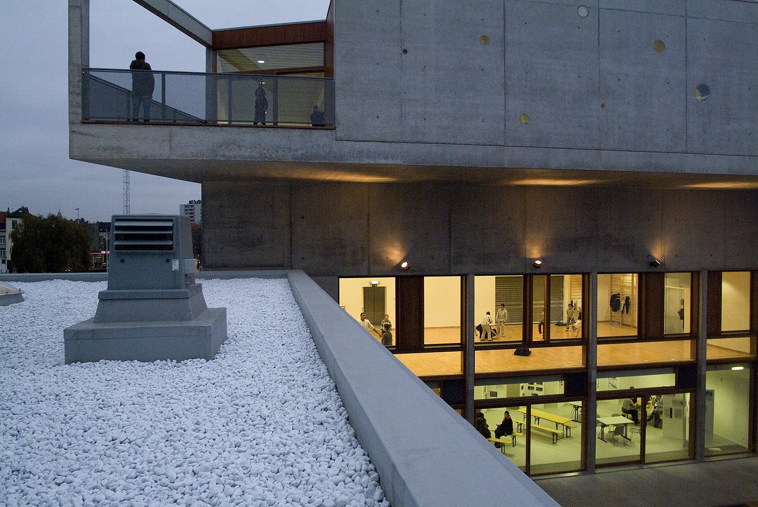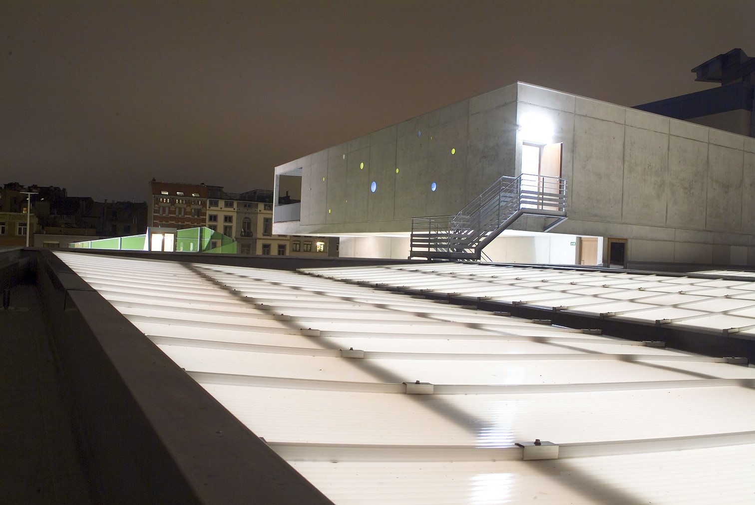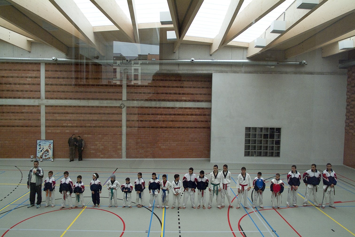 Lancé en 2005 par la commune de Molenbeek Saint-Jean, le nouveau complexe sportif dessiné par Pierre Blondel Architectes accueille à la fois les sportifs et la maison de quartier. Le projet se compose de deux entités clairement identifiables, leur raccord aux bâtiments voisins provoque la création d’un parvis. Celui-ci crée une zone de recul devant le projet, lui offrant une bonne visibilité et accessibilité.