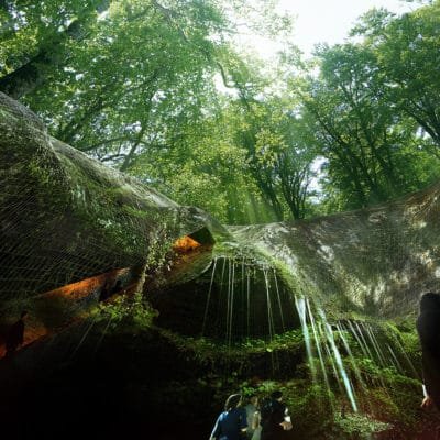 Avant de pénétrer dans la grotte, le visiteur doit empreinter un passage taillé dans la roche long de 100 mètres ascendant. Cette étape permet au visiteur de s’accoutumer de cette nouvelle lumière zénithale qui tend vers l’obscurité au fur et à mesure que l’on avance. Les divers sens sont sollicités, le visiteur doit s’accommoder de cet effort pour découvrir le lieu. L’hygrométrie et la température évoluent, le visiteur est fin prêt à entrer dans le FAC-similé.