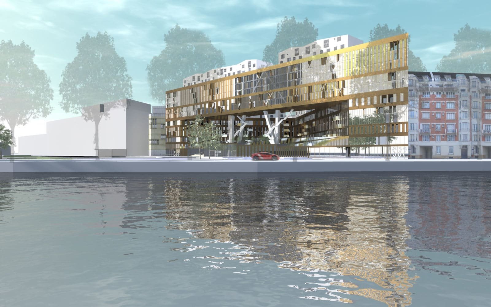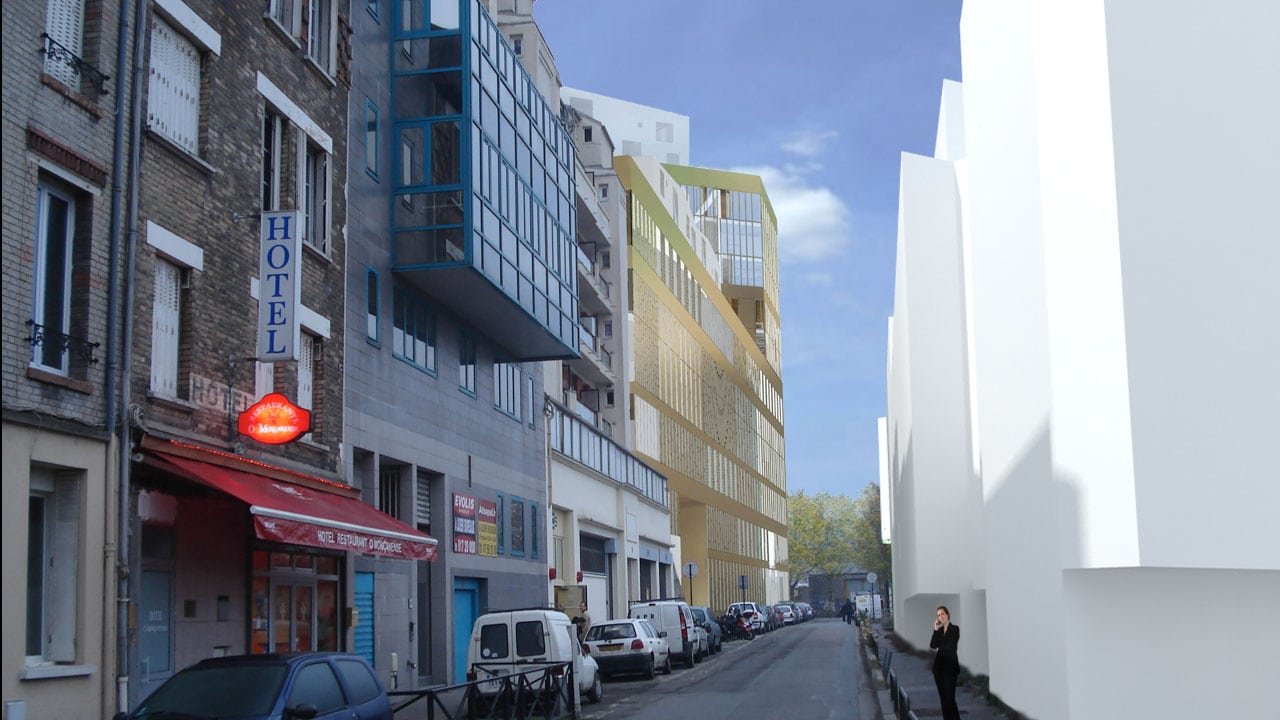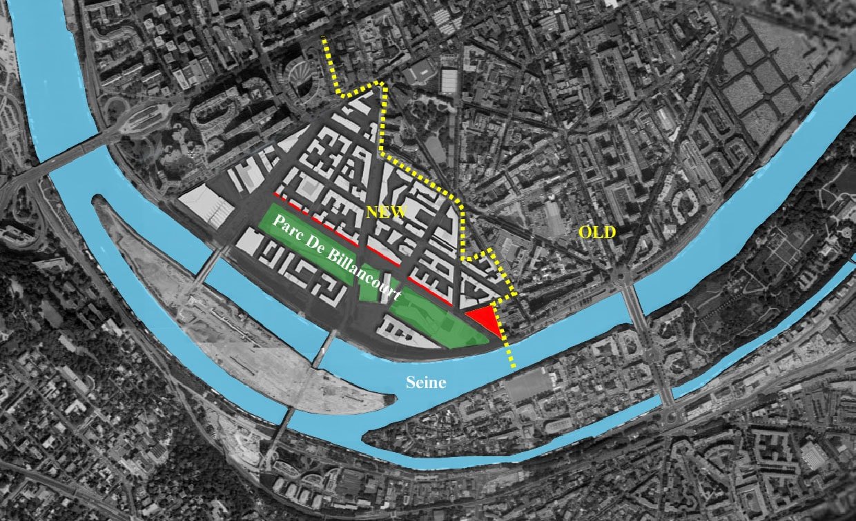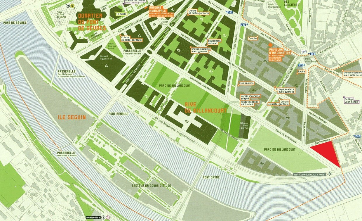 Au bord de la seine, sur les anciennes usines Renault, le projet est bordé par le parc de Billancourt et la rue traversière. Nous avions déjà évoqué deux réalisations de ce quartier, une par GPAA, une autre par Mateo Arquitectura.