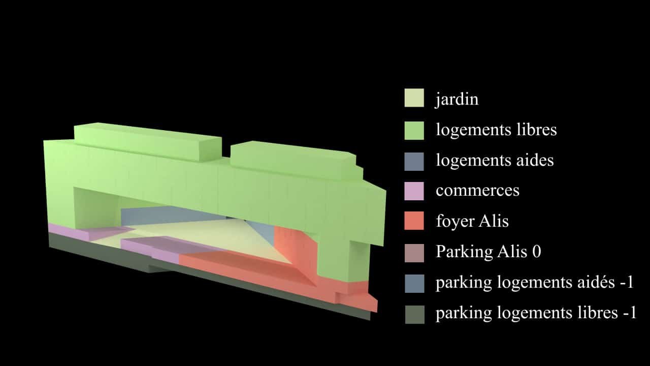 La forme a été travaillé afin d’offrir une vue unique. A l’origine une barre de douze étages, elle vient se fractionner en deux, la partie inférieure de sept niveaux épouse la rue traversière et les constructions existantes. Les logements sont orientés vers le parc, le retrait permet d’atténuer le bruit de trafic. Le bâtiment abrite le foyer Alis et principalement des logements d’aides à accession à la propriété.