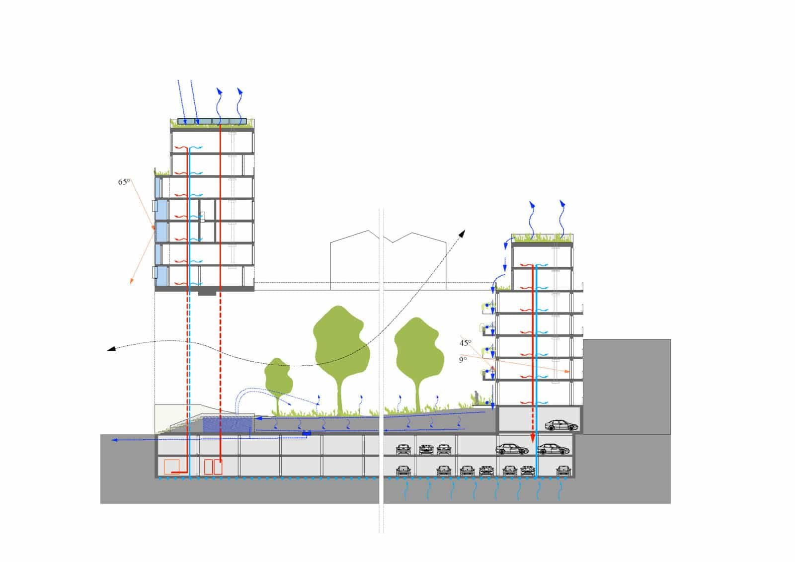 L’ensemble repose sur trois niveaux de parking dont deux en sous-terrain. Le jardin crée au-dessus du parking engendre un dénivelé d’un niveau depuis la rue. Sa végétalisation assure une transition entre le parc et les logements. Les deux derniers niveaux en attique sont en retrait de la façade, ils offrent une deuxième réponse en termes de logements.