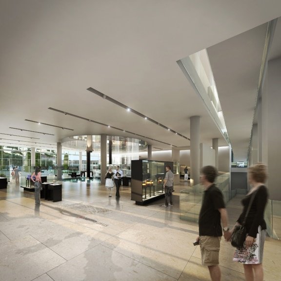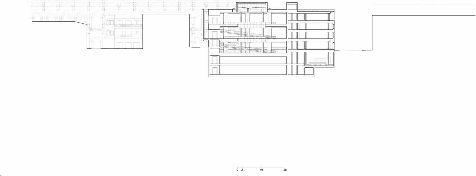 Les parties sud et nord du musée fonctionnent avec des hauteurs sous-plafond différentes, ceci permet aux architectes d’insérer un niveau supplémentaire sous la terrasse, dans la droite ligne de l’auditorium, situé en sous-sol.