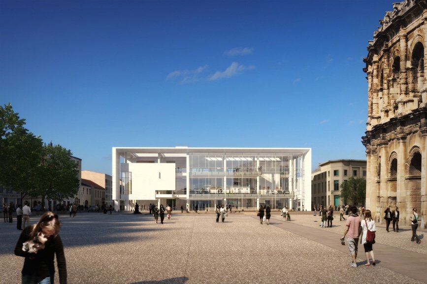 Le bâtiment oublie l’espace temporel en effaçant la limite entre le musée et l’Arène romaine de Nîmes. À travers ce grand rideau de verre, le passant est invité à découvrir les collections du musée. Le visiteur, à l’intérieur lui, peut à tout moment confronter les 25 000 pièces avec l’Arène. Le musée s’ouvre au dialogue avec l’arène dégageant une image forte d’un musée contemporain.